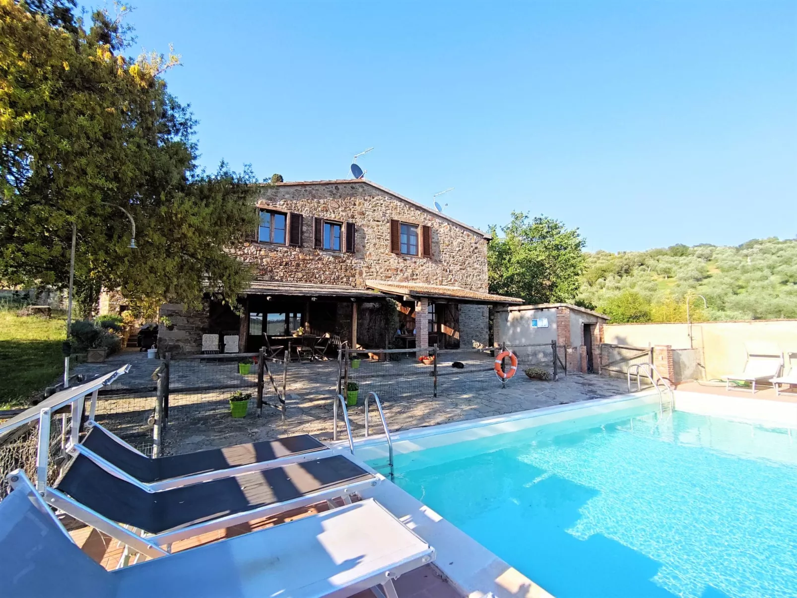 "Cipresso", halfvrijstaand huis 5-kamers 100 m2 op 2 verdiepingen, op de begane grond. Volledig gerenoveerd, smaakvol ingericht: 1 2-pers. kamer. Woon-/eetkamer met eettafel. Uitgang naar het terras, naar het zwembad. 1 kamer met 2 bedden. Kookhoek (oven, afwasmachine, diepvriezer, elektrische koffiemachine). Douche/bidet/WC. Bovenverdieping: woonkamer met panoramavenster met 1 divanbed. 1 open 2-pers. kamer. Douche/bidet/WC. Verwarming (extra). Groot terras, prieel. Terrasmeubelen, barbecue (verrijdbaar), ligstoelen. Zeer mooi panoramazicht op het landschap. Ter beschikking: wasmachine, kinderbed. Internet (WiFi, gratis). Maximaal 1 huisdier/hond toegestaan. De eerste verdieping is een grote open ruimte welke bestaat uit een slaapkamer met een slaapbank en een eigen badkamer. Privé ruimtes buiten met toegang zowel vanaf de begane grond als vanaf de eerste verdieping. IT053002B5S6IC7I49