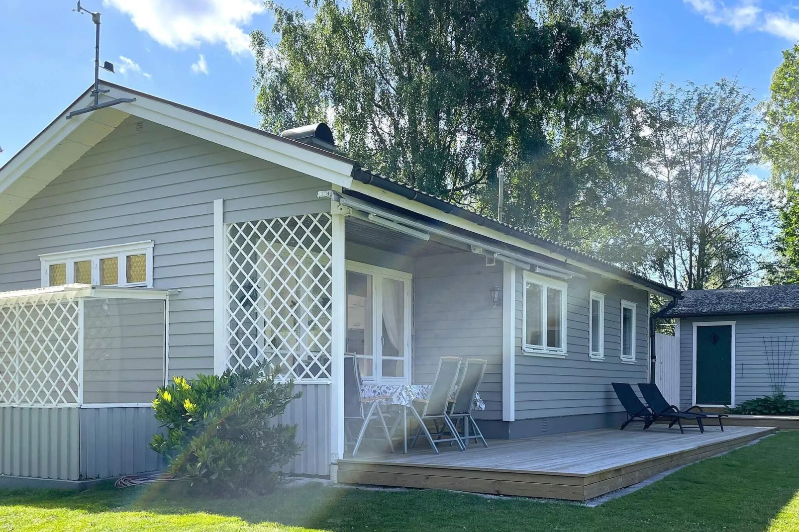 Hell und wohnlich eingerichtetes Ferienhaus mit schönem Meerblick! Hier können Sie bis zum Wasser blicken und wunderschöne Sonnenuntergänge genießen. Das Ufer ist zu Fuß erreichbar. Innen gute Raumaufteilung und Ausstattung. Außen schöne Terrasse mit Holzgeländer und Sitzgelegenheiten. Vom Eingang geht es in eine kleine, helle Eingangsdiele. Direkt links liegt ein Schlafzimmer mit zwei 80 cm breiten Einzelbetten. Angrenzend befindet sich das zweite Schlafzimmer mit einem 160 cm breiten Doppelbett. Geradeaus liegt das komplett geflieste, helle Badezimmer mit Dusche/WC und angenehmer Fußbodenheizung. Der kleinere Küchenbereich liegt in offener Verbindung zur Ess- und Sitzecke im Wohnzimmer mit bequemem Sofa und Sesseln sowie einem schönen Kaminofen für kühlere Abende. Brennholz ist inklusive. Das Wasser ist frisch und trinkbar direkt aus der Leitung – geprüft und zugelassen. Von der schönen Terrasse an der Rückseite des Hauses sowie oben vom Felsen mit Sitzbank hat man einen wunderbaren Ausblick zum Sonnenuntergang genießen. Das kleinere Gästehäuschen nebenan auf dem Grundstück verfügt über zwei Einzelbetten mit 90 cm Breite. Das Grundstück ist üppig bewachsen und uneinsehbar, es bietet zudem Spielfläche für Kinder. Als Ausflugsziele in Reichweite bieten Sie u.a. Göteborg, das EKZ Torp in Uddevalla sowie der Ort Ljungskile mit u.a. Kaffee, Eiscafé, Kaltbadehaus, Krabbenfischen, Muschelbar etc. an.
