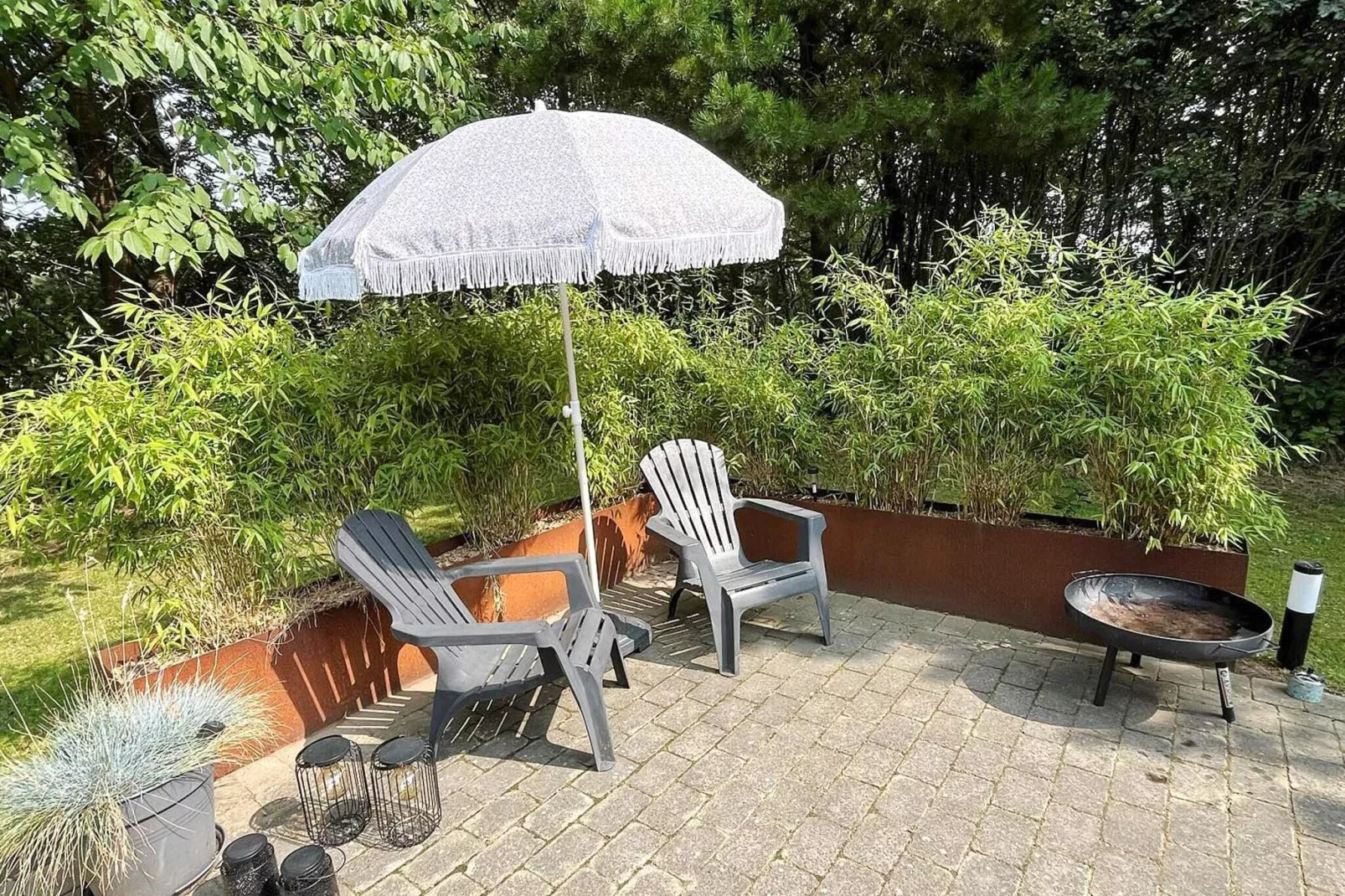 Het middelpunt van het huis is de open keuken-/woonruimte met eet- en zithoek voor het gezinsleven. Van hieruit heeft u toegang tot het grote, omringende terras, waar u overdag zonnige of beschutte zitplaatsen kunt vinden. Het terras nodigt ook uit tot barbecuen. Omheinde tuin ter bescherming van peuters en viervoeters. Op het grote grasveld van het huis kunnen de kinderen zich uitleven. Daar staan onder andere een voetbalgoal, schommel, zandbak, wip en tuintrampoline (gebruik op eigen risico) klaar.