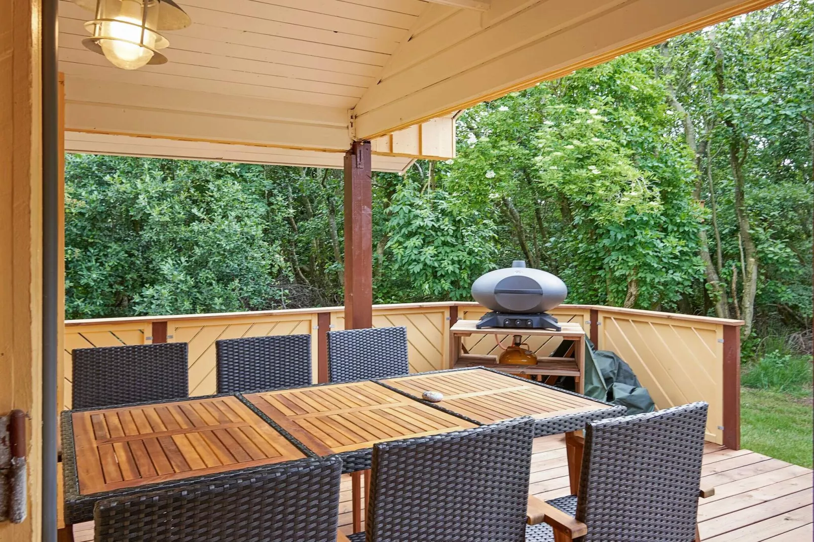 Het traditionele houten huis biedt met zijn zichtbare dakbalken een bijzonder gezellige sfeer en een huiselijke ambiance. Het heeft een lichte keuken met onder andere een keramische kookplaat, afzuigkap en vaatwasser. Vanuit de open gecombineerde woon-/eetruimte heeft u directe toegang tot het gedeeltelijk overdekte houten terras dat rondom het huis loopt.
