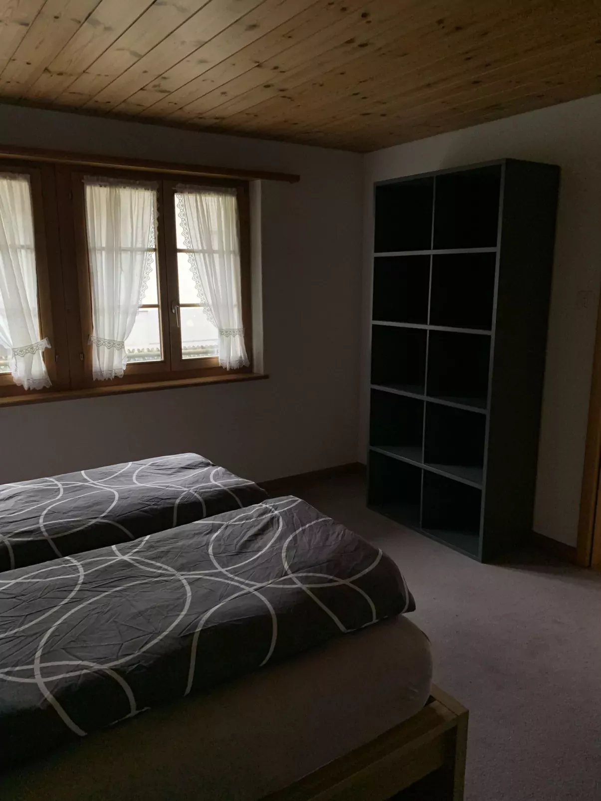 108 m2. Meer informatie beschikbaar bij de aanbieder: Beautiful 4-room flat on the ground floor in a chalet with 3 flats, central location, close to the bus station and the valley stations of the mountain railways. 1 double bedroom, 1 bedroom with 2 single beds and a small bedroom with 1 single bed. Living room with sitting area, dining table, TV, bathroom with bathtub/WC. Kitchen with oven, dishwasher, coffee machine, kettle, fondue and raclette set. Terrace with garden furniture and store. No pets allowed. All linen (sheets, bedsheets, bath towels and kitchen linen) available.