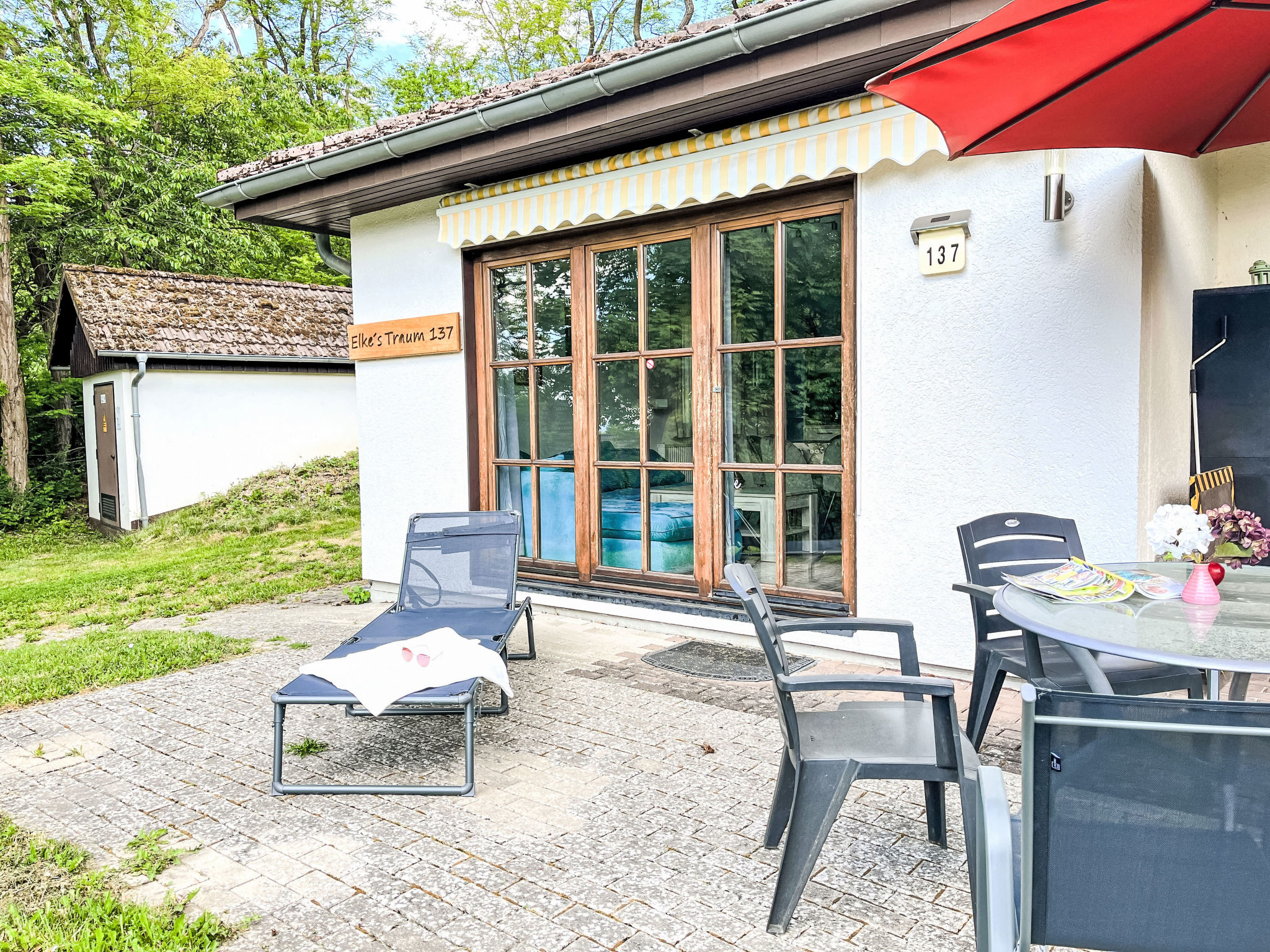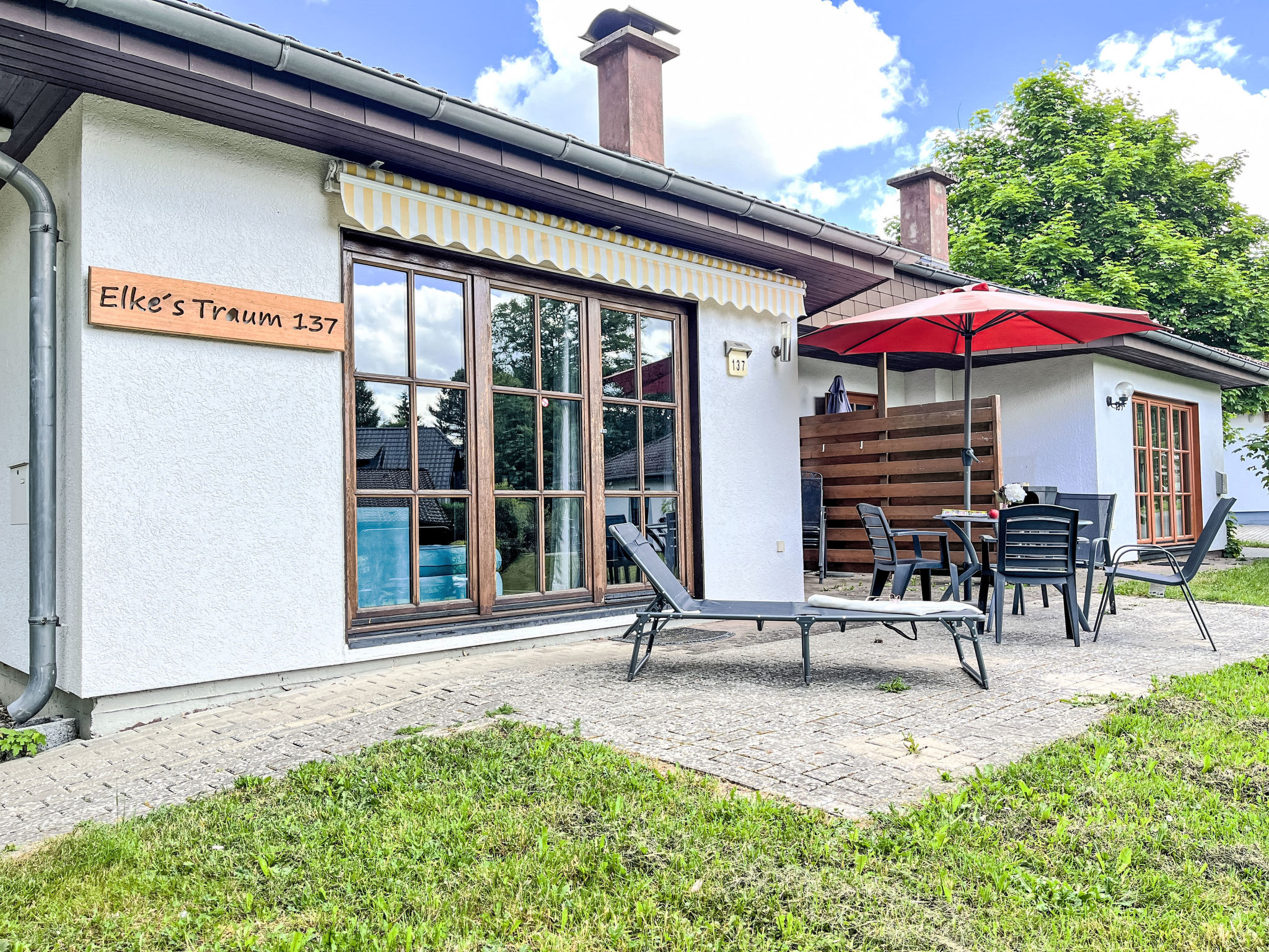 "Elke's Traum", bungalow 4-kamers 75 m2, op de begane grond. Smaakvol en gezellig ingericht: woon-/eetkamer 30 m2 met zwedenkachel en Kabel-TV (Flatscreen TV). Uitgang naar het terras. 1 kamer 12 m2 met 1 2-pers bed (180 cm, lengte 200 cm). 1 kamer 10 m2 met 1 2-pers bed (180 cm, lengte 200 cm). 1 kamer 10 m2 met 2 bedden (90 cm, lengte 200 cm). Kookhoek (oven, afwasmachine, 4 keramische glas kookplaten, broodrooster, waterkoker, elektrische koffiemachine). Douche/WC. Elektrische verwarming. Groot terras 40 m2 gedeeltelijk overdekt, op het zuiden gelegen, gazon 50 m2. Terrasmeubelen, barbecue (verrijdbaar). Ter beschikking: wasmachine, droger, strijkijzer, kinderstoel, kinderbed, haardroger, haardhout (extra). Internet (WiFi, gratis). Parkeerplaats op 10 m. Rookvrij huis. Rookmelders, brandblusser.