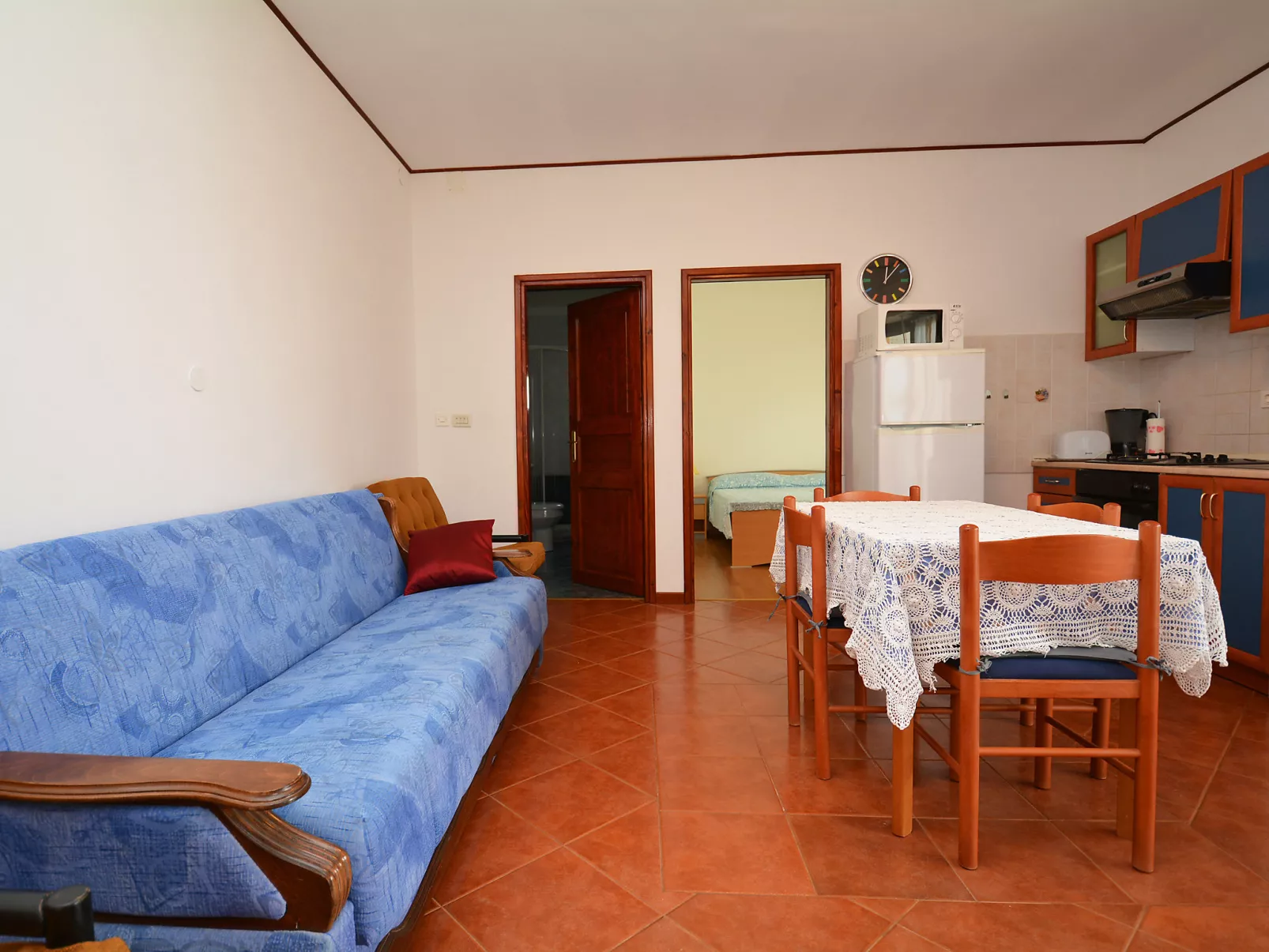 Appartement 3-kamers 49 m2, op de begane grond. Gezellig ingericht: woon-/eetkamer met Sat-TV en air-conditioning. Uitgang naar het balkon. 1 kamer met 1 2-pers bed (160 cm). Uitgang naar het balkon. 1 kamer met 2 bedden. Open keuken (4-pits kookplaat, oven, afwasmachine, diepvriezer). Douche/WC. Geen verwarmingsmogelijkheid. Balkon 9 m2. Terrasmeubelen. Uitzicht op het landschap. Ter beschikking: wasmachine. Internet (Internet (WiFi), gratis).