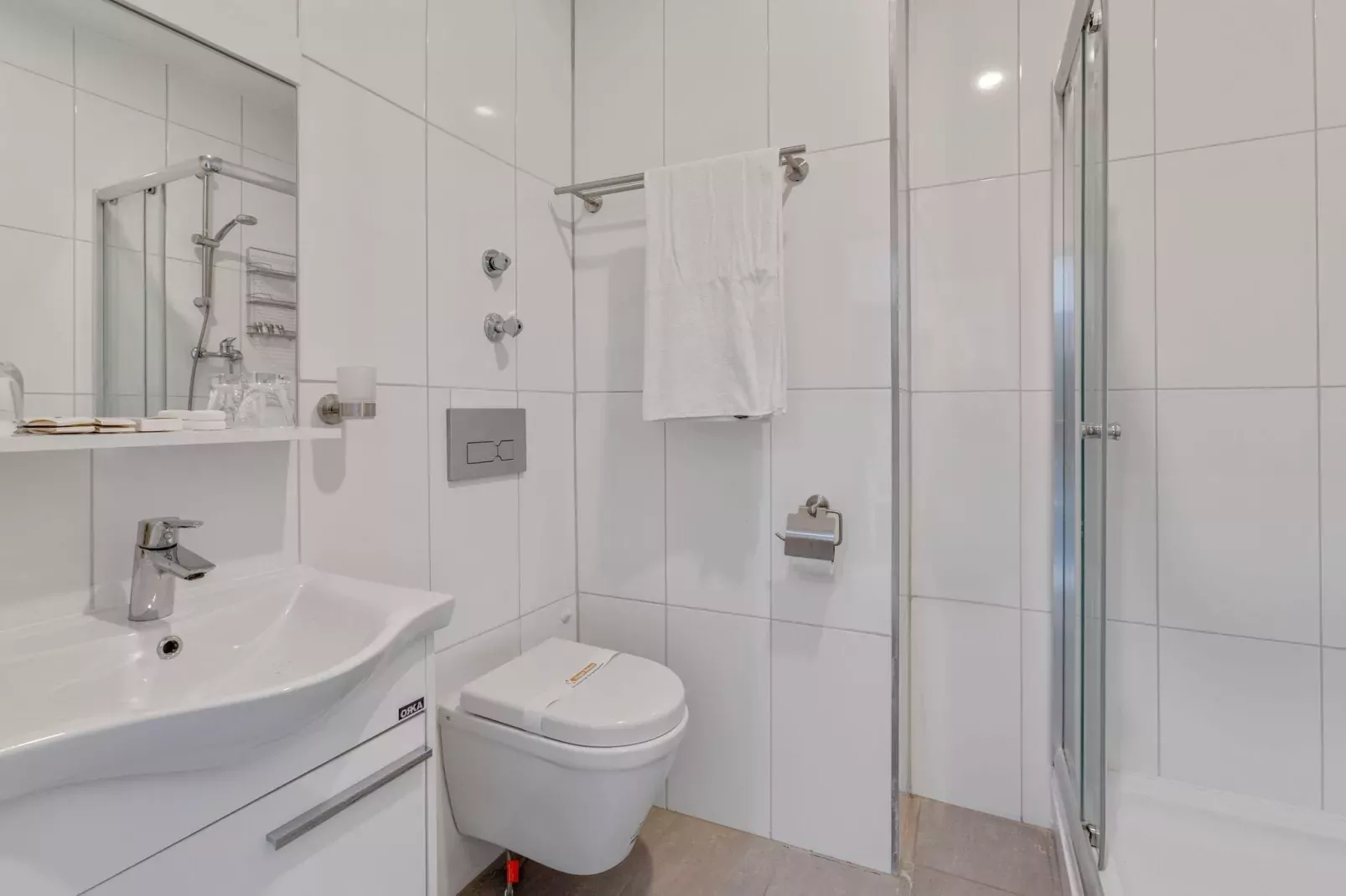 Het appartement beschikt over twee badkamers: één met douche, toilet en föhn, en de andere met wastafel, toilet en urinoir. Gasten kunnen gebruikmaken van een gedeelde kamer met tv, eettafel en zithoek, plus een terras met tuinmeubilair om buiten te ontspannen. Parkeren is mogelijk op het terrein.
