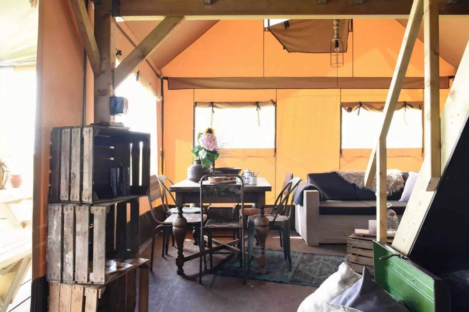 Binnen is de lodge zorgvuldig ontworpen met drie slaapkamers, waaronder een hoofdslaapkamer met een tweepersoonsbed en een knus stapelbed voor de kinderen, allemaal weggestopt in charmante houten bedstee. Een vaste trap leidt naar de bovenverdieping, waar twee eenpersoonsbedden extra slaapruimte bieden. De badkamer is uitgerust met een douche, toilet en wastafel, zodat aan alle benodigdheden is gedacht. De woonkamer is voorzien van een comfortabele bank en een eettafel, perfect voor gezamenlijke maaltijden of spelletjesavonden bij de warmte van de houtkachel.
