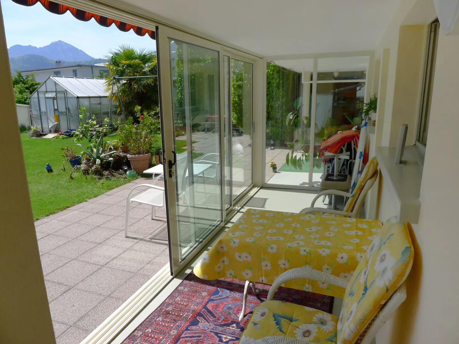 Appartement 1-kamer 31 m2, op de begane grond. Doelmatig en gezellig ingericht: 1 kamer 17 m2 met 1 2-pers bed en Sat-TV (Flatscreen TV). Uitgang naar de zitplaats in de tuin. Woonkeuken (oven, afwasmachine, 4 keramische glas kookplaten, magnetron) met eettafel. Douche/WC. Zithoek in de tuin 8 m2, op het zuiden gelegen. Terrasmeubelen, serre. Beperkt uitzicht op het meer, de bergen en de plaats. Ter beschikking: Internet (Internet (WiFi), gratis). Parkeerplaats bij het huis. Niet rokers woning.
