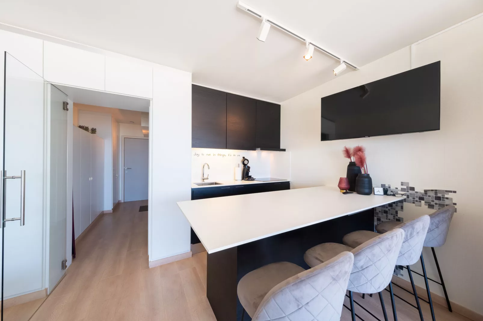 Deze stijlvolle en recent gerenoveerde studio, gelegen op de 5de verdieping, biedt alles wat u nodig heeft voor een zorgeloze vakantie aan zee. Dankzij de uitstekende ligging op de zeedijk geniet u van een onvergetelijk panoramisch zicht op de Noordzee en bevindt u zich bovendien vlak bij een tramhalte, ideaal voor uitstapjes langs de kust. De lichte en gezellige woonkamer nodigt uit tot ontspanning en geeft rechtstreeks toegang tot het ruime terras, waar u kunt genieten van de frisse zeelucht en het rustgevende geluid van de golven. Perfect voor een ontspannen ontbijt in de ochtendzon of een glaasje bij zonsondergang. De moderne open keuken met centraal kookeiland is volledig ingericht met alle hedendaagse toestellen en biedt alles wat u nodig heeft om zelf een heerlijke maaltijd te bereiden. De slaapruimte is slim ontworpen om optimaal gebruik te maken van de beschikbare ruimte. De studio beschikt over een comfortabel kastbed voor 2 personen en een handig opklapbaar stapelbed dat eveneens plaats biedt aan 2 personen – ideaal voor gezinnen met kinderen of een verblijf met vrienden. De badkamer is uitgerust met een ligbad en toilet, zodat u na een dag op het strand heerlijk kunt ontspannen. Kortom, deze volledig vernieuwde studio combineert modern comfort, een schitterende ligging en een fenomenaal zeezicht – de perfecte plek voor wie op zoek is naar een gezellige vakantie aan de Belgische kust. Wifi: ja - parking: niet inbegrepen - lakens: zelf meenemen - handdoeken: zelf meenemen.