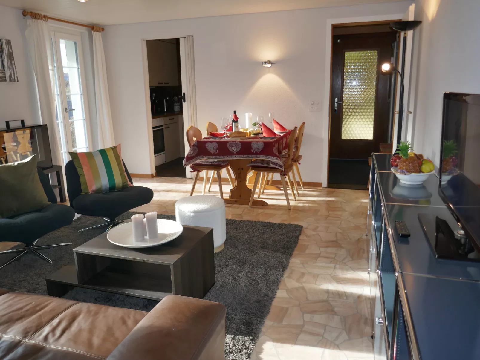 Appartement 2-kamers 53 m2, op de begane grond, op het zuiden gelegen. Het objekt is geschikt voor 2 volwassenen + 2 kinderen. Licht, comfortabel en gezellig ingericht: open woon-/eetkamer met eettafel, Kabel-TV, Flatscreen TV en DVD´s beschikbaar. Uitgang naar het terras, op het zuiden. 1 kamer met 1 bed (160 cm, lengte 200 cm), 1 x 2 stapelbedden (90 cm, lengte 190 cm). Kleine keuken (3-pits kookplaat, oven, afwasmachine, broodrooster, waterkoker, magnetron, elektrische koffiemachine, pads voor de koffiemachine (Nespresso) extra, raclette oven, fondue Set (kaas)). Bad/WC. Terras 15 m2, op het zuiden gelegen. Terrasmeubelen. Mooi uitzicht op de bergen, het landschap en Eiger. Ter beschikking: wasmachine, haardroger. Internet (WiFi, gratis). Parkeerplaats (1 Auto), garage nr. 42D. Geschikt voor families. Niet rokers woning. Maximaal 1 huisdier/hond toegestaan. Privé ingang, brandblusser.