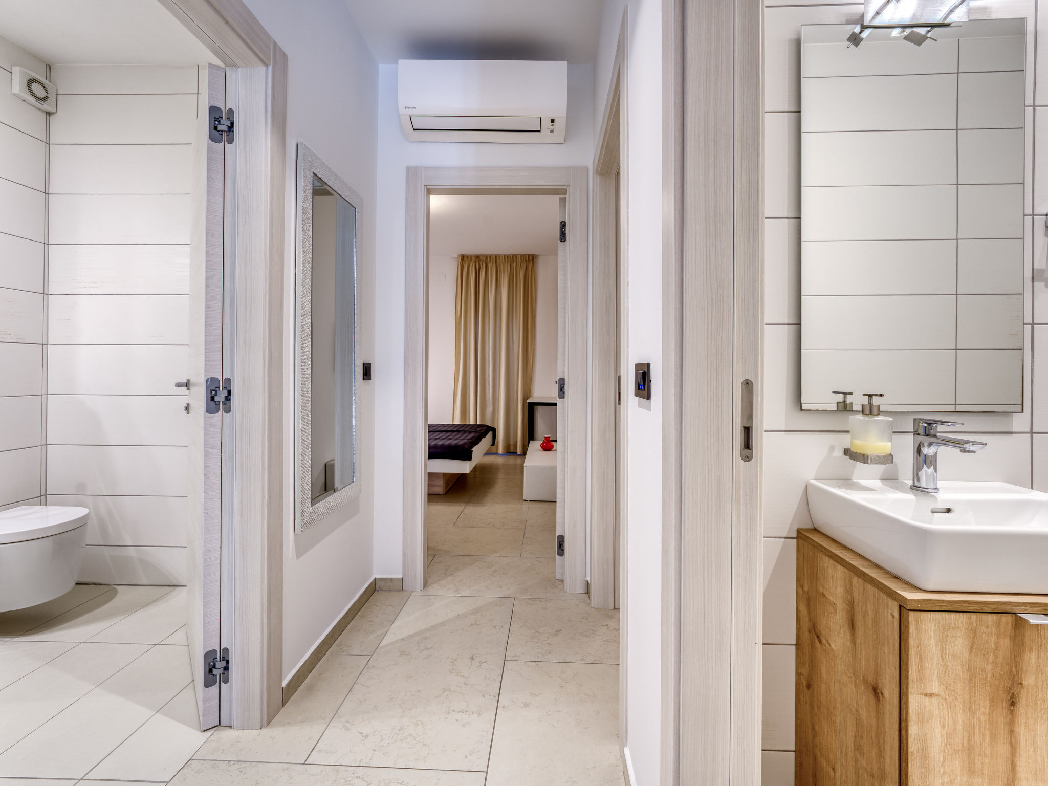 "Dita 3", appartement 3-kamers 75 m2, op de begane grond. Modern ingericht: woon-/eetkamer met 1 2-pers divanbed (140 cm, lengte 180 cm), Sat-TV. 1 kamer met 1 2-pers bed (160 cm, lengte 200 cm), Sat-TV. 1 kamer met 2 bedden (90 cm, lengte 200 cm). Open keuken (afwasmachine, 2 inductiekookplaten, broodrooster, waterkoker, magnetron, elektrische koffiemachine). Douche/WC, aparte WC. Heteluchtverwarming. Terras 12 m2. Terrasmeubelen. Ter beschikking: kinderbed, haardroger. Internet (WiFi, gratis).