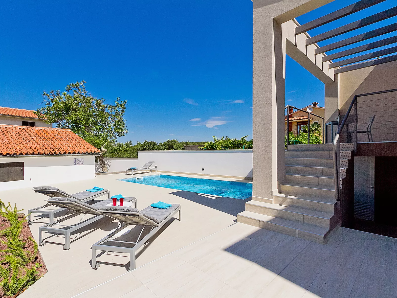Salakovci 4 km van Labin: Moderne twee onder één kap woning "Albona Luna", van 2 verdiepingen. 10 km van het centrum van Rabac, zonnige ligging tegen een helling, 5 km van zee. Voor alleengebruik: terrein 400 m2 (omheind), openluchtzwembad hoekig (7 x 3 m, 140 cm diepte, seizoensgebonden beschikbaarheid: 27.Apr. - 28.Sep.) met trap. Barbecue. In het huis: internetaansluiting, wasmachine. Parkeerplaats bij het huis op het terrein. Winkel 6 km, supermarkt 6 km, restaurant 5 km, bushalte 5.3 km, kiezelstrand 5 km, rotsstrand 5 km. Tennis 10 km, wandelroutes 1 km vanaf het huis, fietspad 1 km. Groepen jongeren uitsluitend op aanvraag. Voor grote groepen met jongeren is een dubbele borg gevraagd bij aankomst. Zwembad met hydromassage.