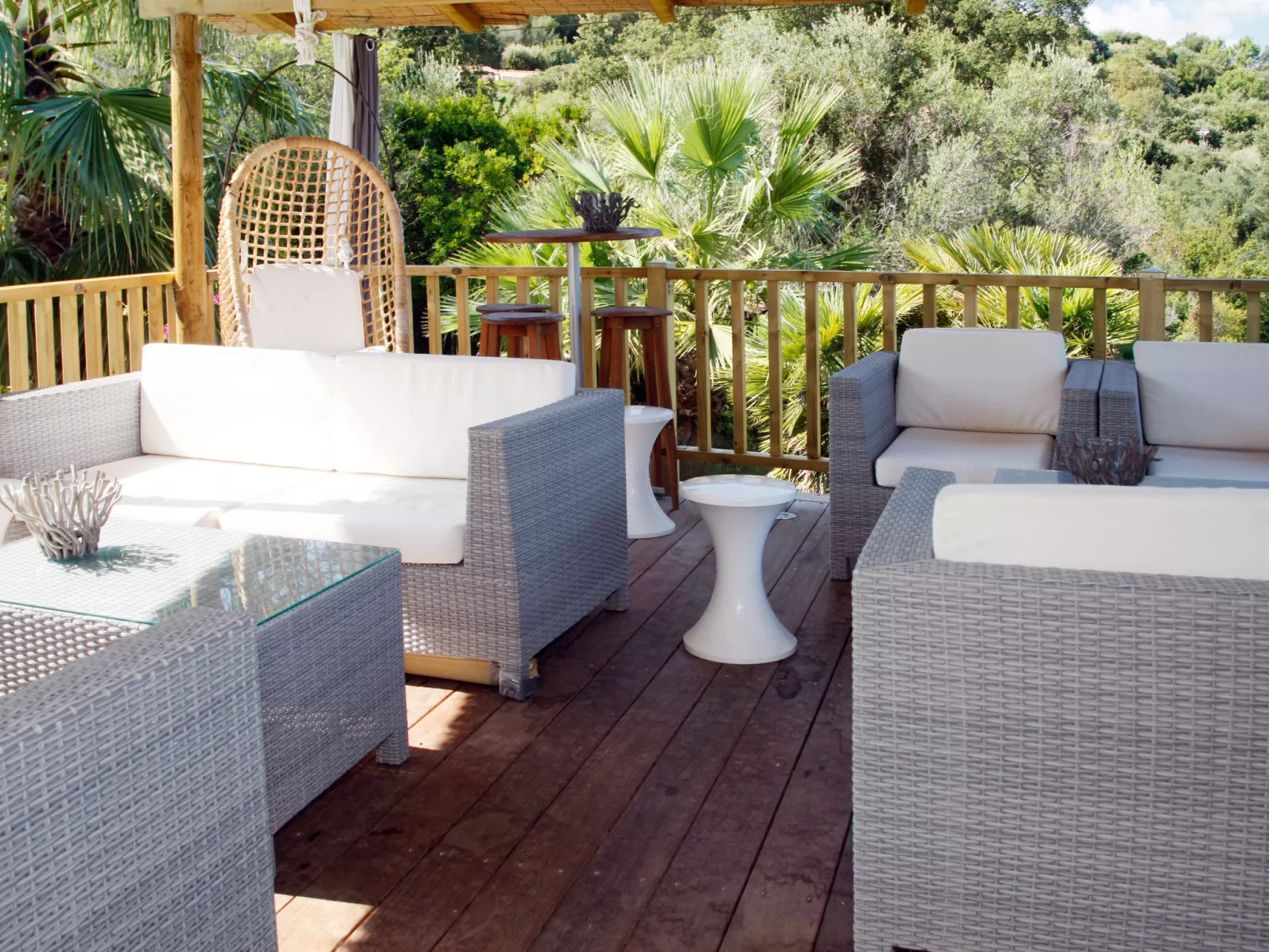 "Fium del Cavu", bungalow 3-kamers 50 m2. Doelmatig ingericht: woon-/eetkamer met 1 divanbed (160 cm, lengte 200 cm), eettafel en ventilator. 1 kamer met 1 bed (90 cm, lengte 190 cm), 1 2-pers bed (180 cm, lengte 200 cm). 1 kamer met 1 2-pers bed (180 cm, lengte 200 cm). Kookhoek (4 kookpitten (vlammen), broodrooster, magnetron, diepvriezer, elektrische koffiemachine) met air-conditioning. Douche, aparte WC. Elektrische verwarming, air-conditioning. Terras. Terrasmeubelen, barbecue, ligstoelen (2). Mooi uitzicht op de tuin, het landschap en de oceaan. Parkeerplaats (1 Auto). Niet rokers woning. Rookmelders. Aanbod door een commerciële eigenaar volgens art. 155, IV, CGI