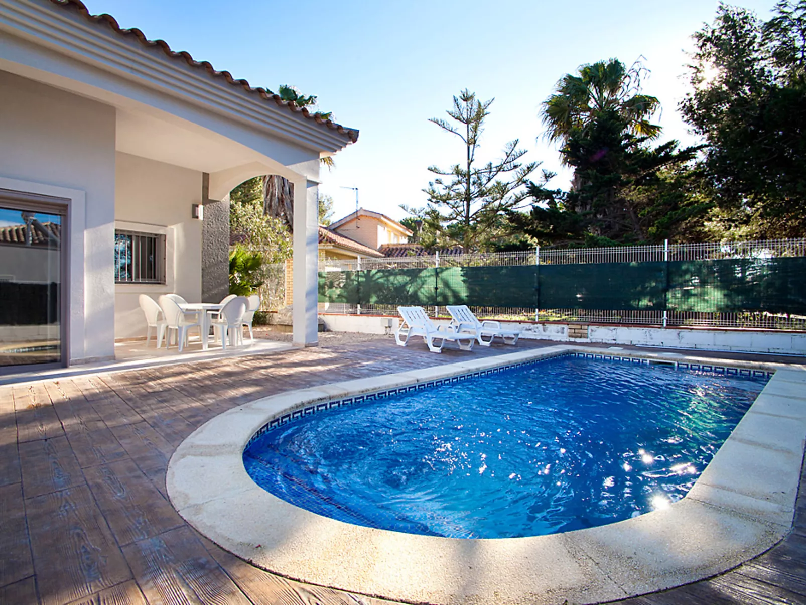 "Gaviota 14", huis 4-kamers 89 m2, op de begane grond. Comfortabel en mooi ingericht: woon-/eetkamer met eettafel, Digitale TV, air-conditioning en heteluchtverwarming. Uitgang naar de zitplaats in de tuin, naar het zwembad. 1 2-pers. kamer met 1 2-pers bed (135 cm, lengte 190 cm), douche/WC. 2 2-pers. kamers, elke kamer heeft 2 bedden (90 cm, lengte 190 cm). Keuken (oven, 4 keramische glas kookplaten, broodrooster, magnetron, diepvriezer, elektrische koffiemachine). Bad/bidet/WC. Air-conditioning, heteluchtverwarming. Terrasmeubelen, barbecue, ligstoelen (2), loggia. Ter beschikking: wasmachine, strijkijzer, klamboe. Internet (WiFi, gratis). Parkeerplaats (omheind) bij het huis. Geschikt voor families. Maximaal 2 huisdieren/honden toegestaan. HUTTE000932 // Reg. Nr.: ESFCTU00004301900065882600000000000000000HUTTE0009326