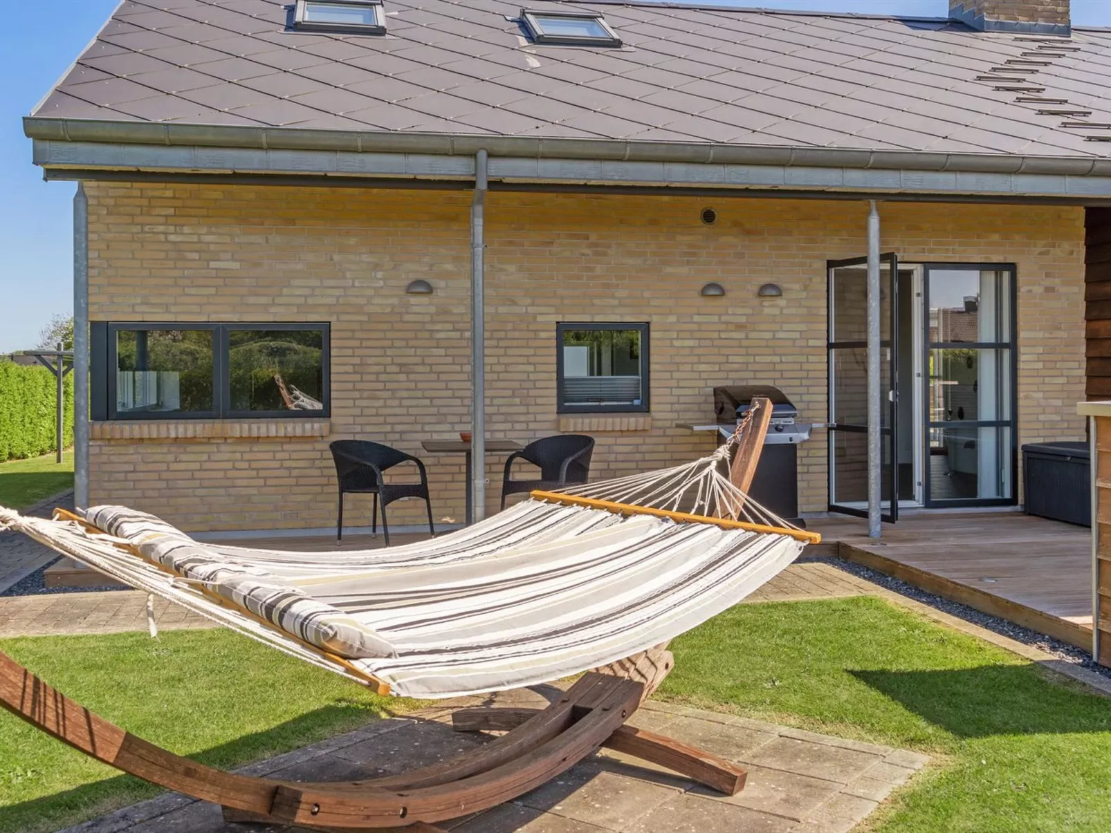 Eengezinswoning, bouwjaar 2008. 700 m van zee. Voor alleengebruik: terrein 1.098 m2, verzorgde tuin. Buitendouche, terras (50 m2), barbecue. In het huis: sauna, wasmachine, droger. Parkeerplaats bij het huis. Carport. Levensmiddelenwinkel 2 km. De eigenaar accepteert geen jeugdgroepen.
