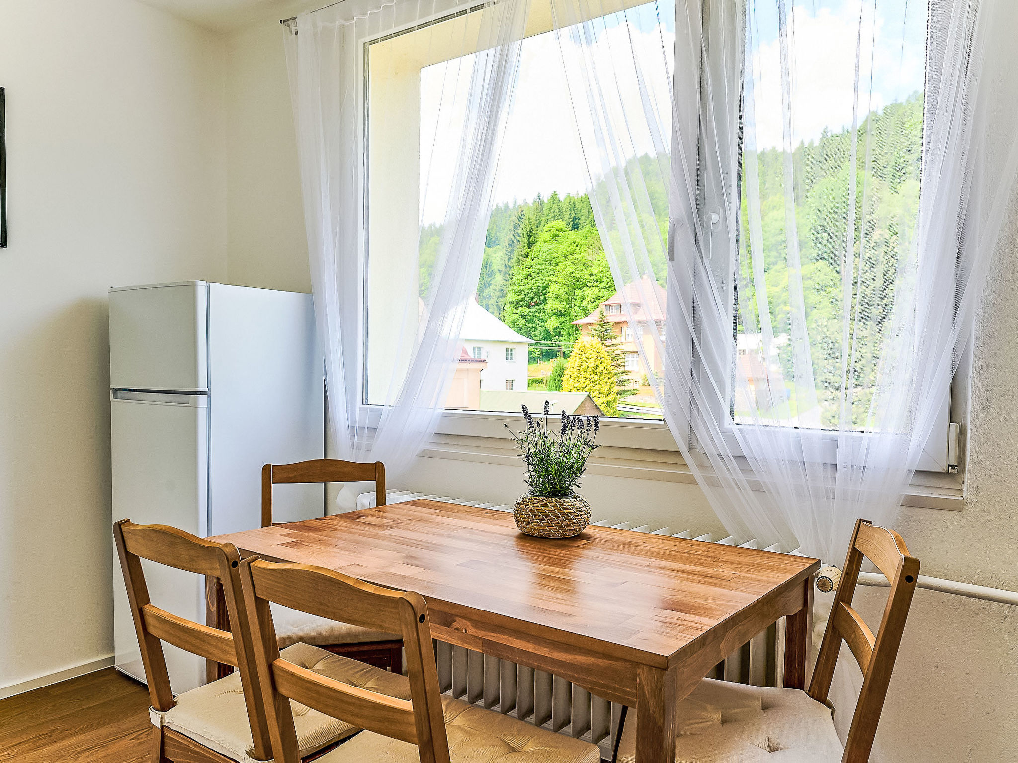 Flatgebouw. Josefův Důl, zonnige ligging, perfecte locatie: in het centrum en toch rustig gelegen, 130 m van het beekje. In het huis: centrale verwarming. Parkeerplaats bij het huis. Supermarkt 20 m, restaurant 300 m, bakkerij 20 m, café 50 m, bushalte "Josefův Důl, centrum" 10 m, treinstation "Josefův Důl" 500 m, 40 m. Midgetgolf 500 m, skilift 1.5 km, skiverhuur 200 m, skischool 1.5 km, kinderskischool 1.5 km, langlaufloipe 100 m, kinderspeelplaats 50 m. Attracties in de buurt: Muzeum 200 m, vyhlídka Čertovy hlavy 1.8 km, Jedlový důl 2 km, vodopády na Jedlové 2.7 km, Slovanka 4 km, Bramberk 6 km, Muzeum výroby hraček Jiřetín 4 km, Liberec: Zoo, Aquapark, iQLANDIA 20 km, Ještěd 30 km. Bekende skigebieden kunnen gemakkelijk worden bereikt: Špičák Tanvald, Albrechtice 5 km, Bedřichov 8 km, Harrachov 20 km. Bekende meren kunnen gemakkelijk worden bereikt: přírodní koupaliště Josefův Důl 1.2 km, Bedřichov 10 km. Wandelgebied Protržená přehrada 5 km, Souš 8 km, Na Čihadle 8 km.