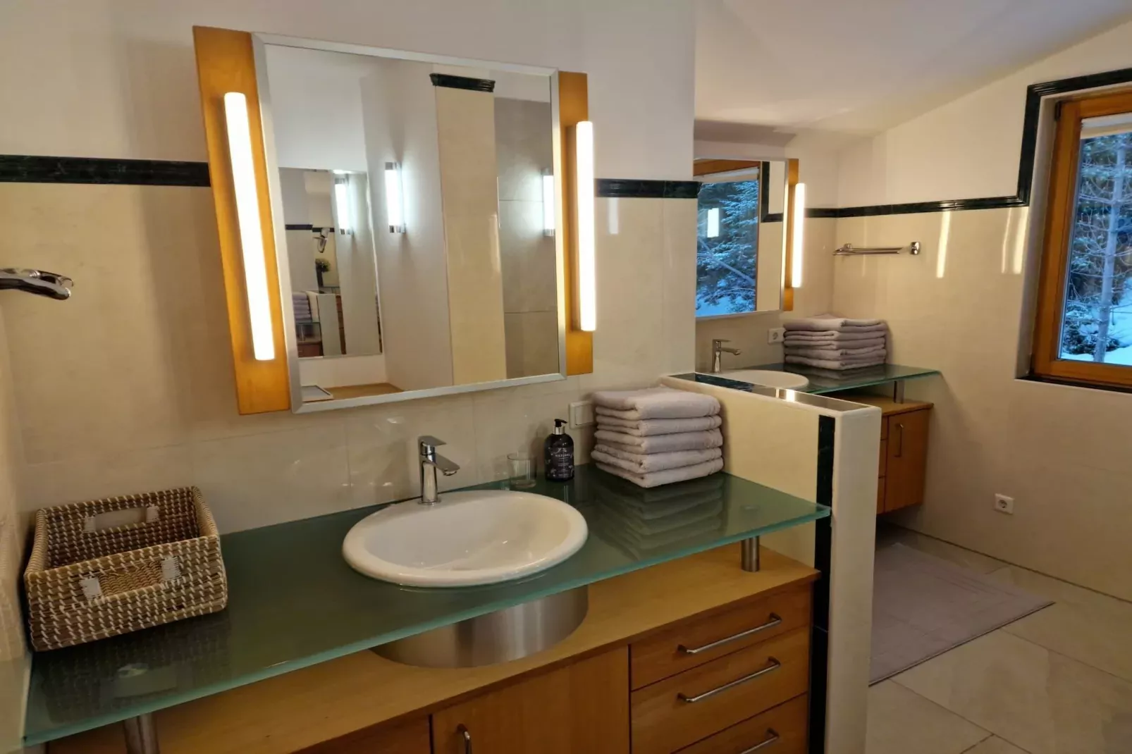 Boven zorgt de slaapkamer van grenenhout voor een goede nachtrust, en een andere gezellige slaapkamer is geweldig voor gezinnen. De ruime badkamer heeft dubbele wastafels, een douche en een kaptafel, met aparte toiletten op elke verdieping. De lichte trainingsruimte biedt een yogamat en een hometrainer, terwijl de panoramische ramen van de woonkamer de bergen laten zien. De kelder biedt een whirlpool, sauna en ligstoelen om te ontspannen. In de zomer is de tuin een privéoase en in de winter is de locatie perfect voor skitochten, met het skigebied Glungezer op slechts 22 minuten afstand.