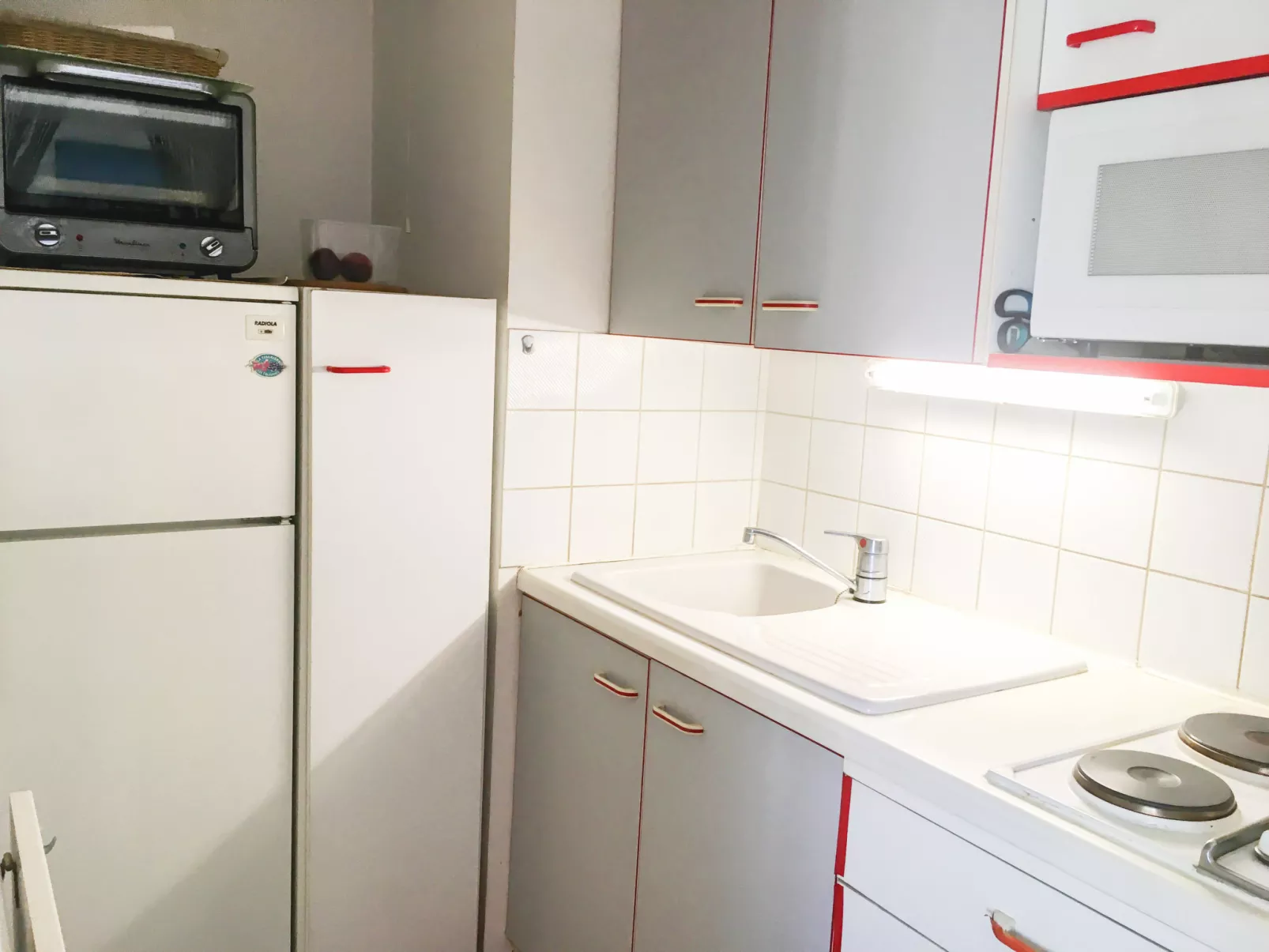 Appartement 2-kamers 31 m2 op 2 verdiepingen op de 2e verdieping. Het objekt is geschikt voor 2 volwassenen. Hal. Woon-/eetkamer met TV (Flatscreen TV). Uitgang naar het balkon, op het oosten en op het zuiden. Kleine keuken (2-pits kookplaat, mini-oven, broodrooster, waterkoker, magnetron, elektrische koffiemachine). Aparte WC. Elektrische verwarming. Bovenverdieping: (wenteltrap), 1 kamer met 1 2-pers bed (1 x 140 cm, lengte 190 cm). Badkamer. Balkon 6 m2, op het oosten gelegen. Balkonmeubilair. Ter beschikking: wasmachine. Internet (Internet (WiFi), extra). Parkeerplaats. Niet rokers woning. Rookmelders, geen lift. FR1804.242.3