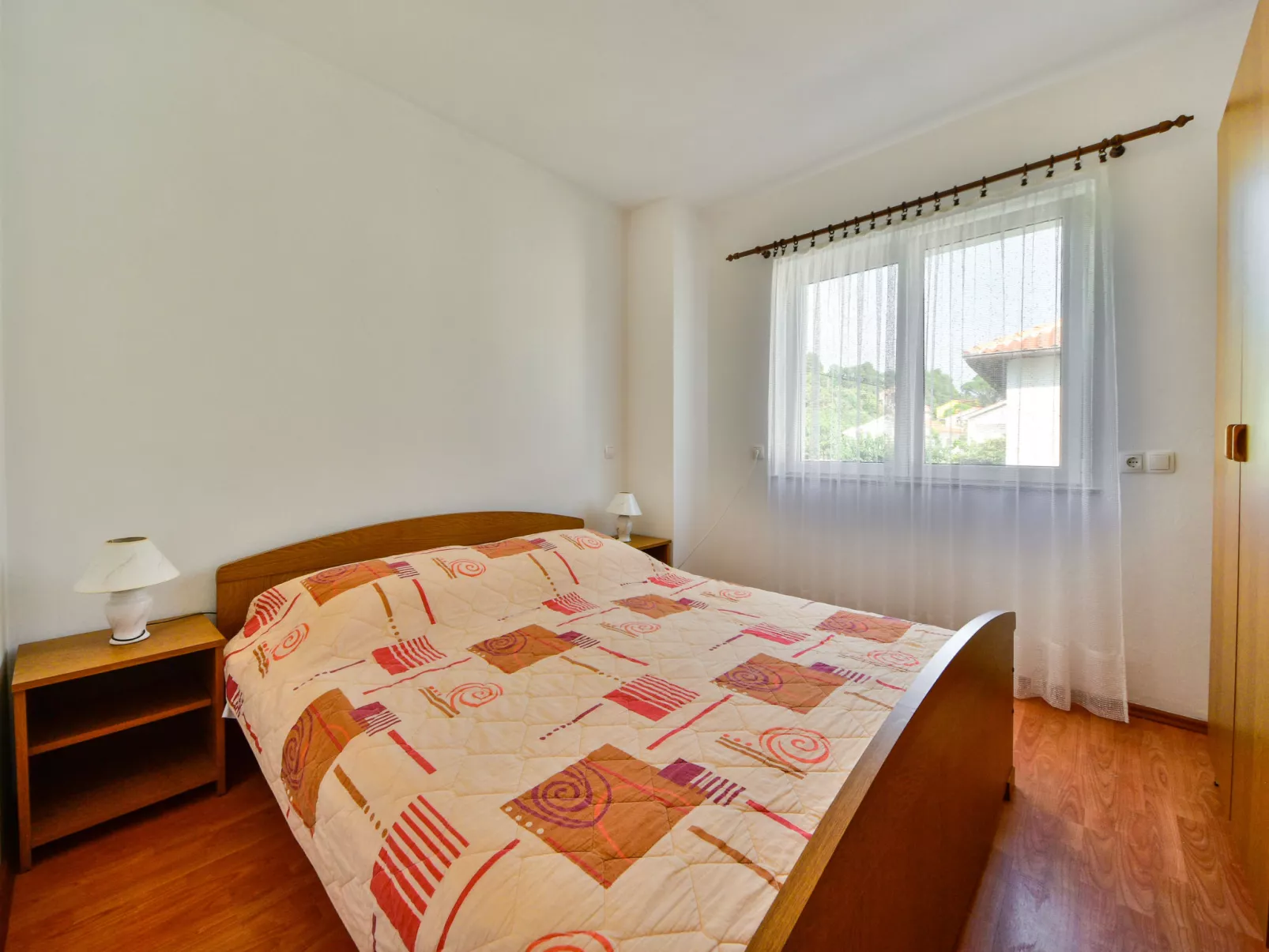 Appartement 2-kamers 40 m2 op de 1e verdieping. Woon-/slaapkamer met 1 2-pers divanbed (180 cm, lengte 200 cm), Kabel-TV en Flatscreen TV. Uitgang naar het balkon. 1 kamer met 1 2-pers bed (2 x 80 cm, lengte 200 cm), douche/WC. Open keuken (oven, 4 keramische glas kookplaten, elektrische koffiemachine) met air-conditioning. Douche/WC. Balkon 6 m2. Balkonmeubilair. Ter beschikking: Internet (WiFi, gratis). Rookvrij huis.