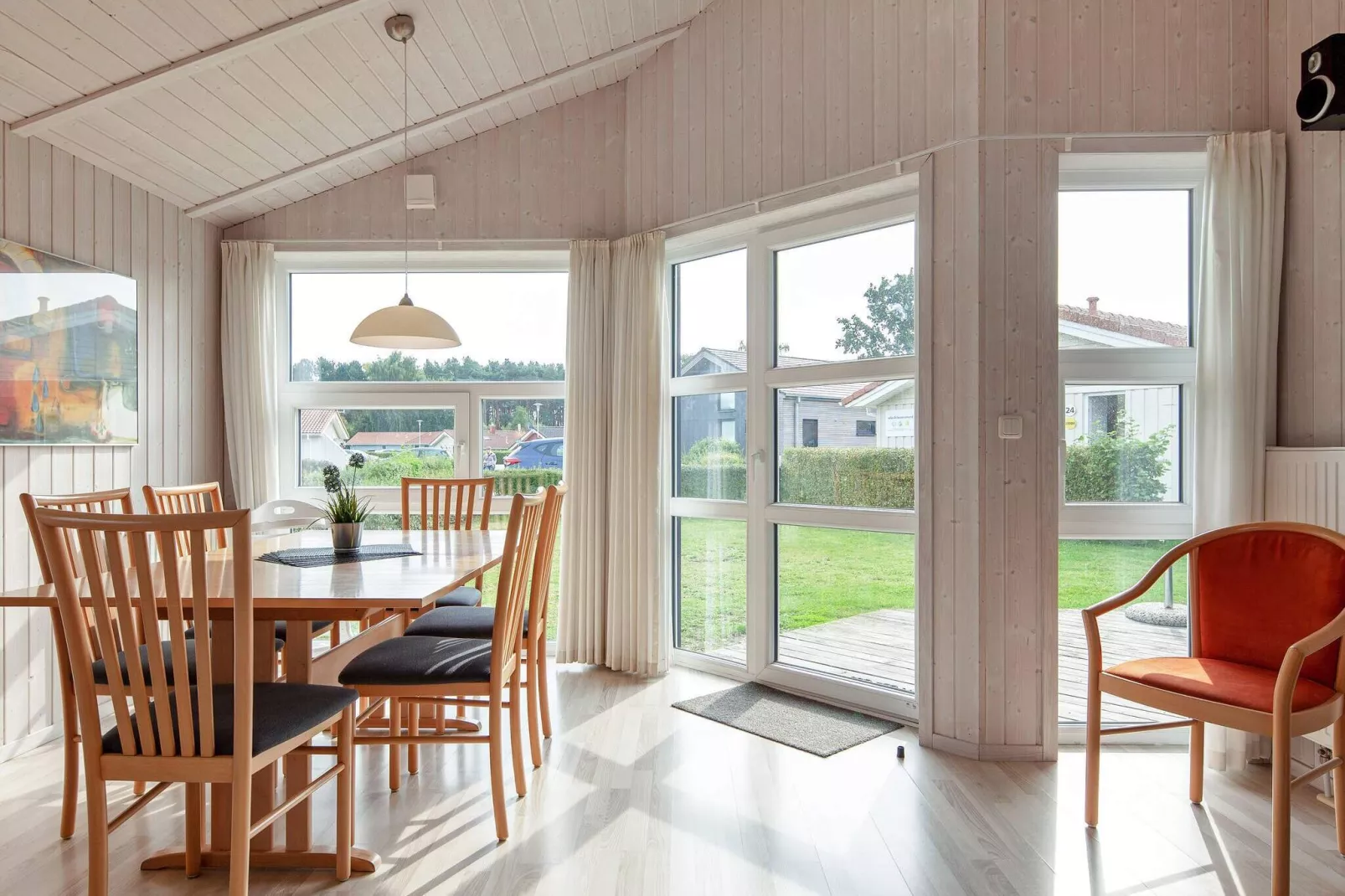2011 gebautes, komfortables Qualitätsferienhaus in dänischer Bauweise im OstseeStrandpark Grömitz und dem Fahrrad von dem Ortskern Grömitz entfernt. Zum Haus gehören 2 Schlafzimmer sowie eine Schlafcouch im Wohnzimmer, eine gut ausgestattete Küche mit u.a. einem Geschirrspüler sowie ein ansprechendes Badezimmer mit Duschkabine und Fußbodenheizung. Die großen Fenster, die modernen Möbel im skandinavischen Design sowie die Holzwände und Dachschrägen sorgen für eine gemütliche, einladende Atmosphäre. Entspannen können Sie sich herrlich in der Sauna, um anschließend die mollige Wärme des Holzofens oder einen guten Film im Fernseher mit SAT-Empfang zu genießen. Vom Wohnzimmer aus gelangen Sie auf die teils überdachte und abgeschirmte Terrasse mit zwei Gartenliegen und ein Sonnenschirm, die zu schönen Sonnenstunden und gemütlichen Grillabenden einlädt. Außer dem attraktiven, kilometerlangen Strand gibt es in der Nähe des Strandparks auch einen Hochseilkletterpark, eine Minigolfanlage, einen Skateboardplatz, ein kleines Familienrestaurant sowie einen Bäcker. Andere mögliche Freizeitaktivitäten sind Ausritte am Strand oder ein Besuch in dem Badeland "Grömitzer Welle". Auch Golfinteressierte kommen hier auf ihre Kosten und können den 18-Loch und 9-Loch Golfplatz Grömitz sowie andere gute Golfplätze besuchen. Kaufen Sie evt. auch das sogenannte Golfpaket, das Ihnen Zugang zu 5 verschiedenen Golfplätzen in der Nähe verschafft. In der Sommer-Hochsaison ist der Lensterstrand ein belebtes Feriengebiet, das sich an eine breite Zielgruppe wendet. Weitere Informationen erhalten Sie im Touristenbüro in der Stadt. Grömitz bietet einen guten Rahmen für schöne Ferien mit herrlichem Strand, einer attraktiven Strandpromenade mit Kunstwerken und harmonisch angelegten Gärten sowie dem modernen Freizeithafen. Hier können Sie Kurse zum Segeln oder Windsurfen belegen sowie diverse Segelscheine erwerben und auf der schön ausgebauten Hafenpromenade finden Sie einen maritimen Spielplatz. Egal zu welcher Jahreszeit Sie Grömitz besuchen, erwartet Sie hier reizvolle Natur, schöne Restaurants und Cafés sowie zahlreiche Kultur- und Freizeiterlebnisse.