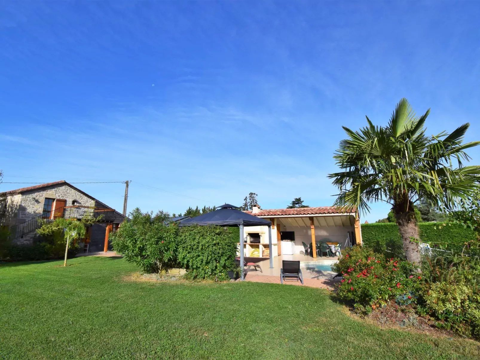 Gezellig, rustieke landhuis "Madaillan", omgeven door velden. In het gehucht Hiot, 5 km van het centrum van Prayssas, 16 km van het centrum van Agen, 25 km van het centrum van Villeneuve-sur-Lot, te midden van groen. Voor alleengebruik: terrein 1.500 m2 (omheind) met gazon, openluchtzwembad (9 x 4 m, 80 - 175 cm diepte, seizoensgebonden beschikbaarheid: 16.Mei. - 03.Okt.) met trap en alarminstallatie. Buitendouche, poolhouse met koelkast en fornuis, jeu de boules, terras. In het huis: tafeltennis. Overdekte parkeerplaats bij het huis op het terrein. Winkel 5 km, supermarkt 7 km, bushalte "Camelat" 10 km. Golfterrein (9 holes) 20 km, manege 5 km, Vismogelijkheden 500 m.