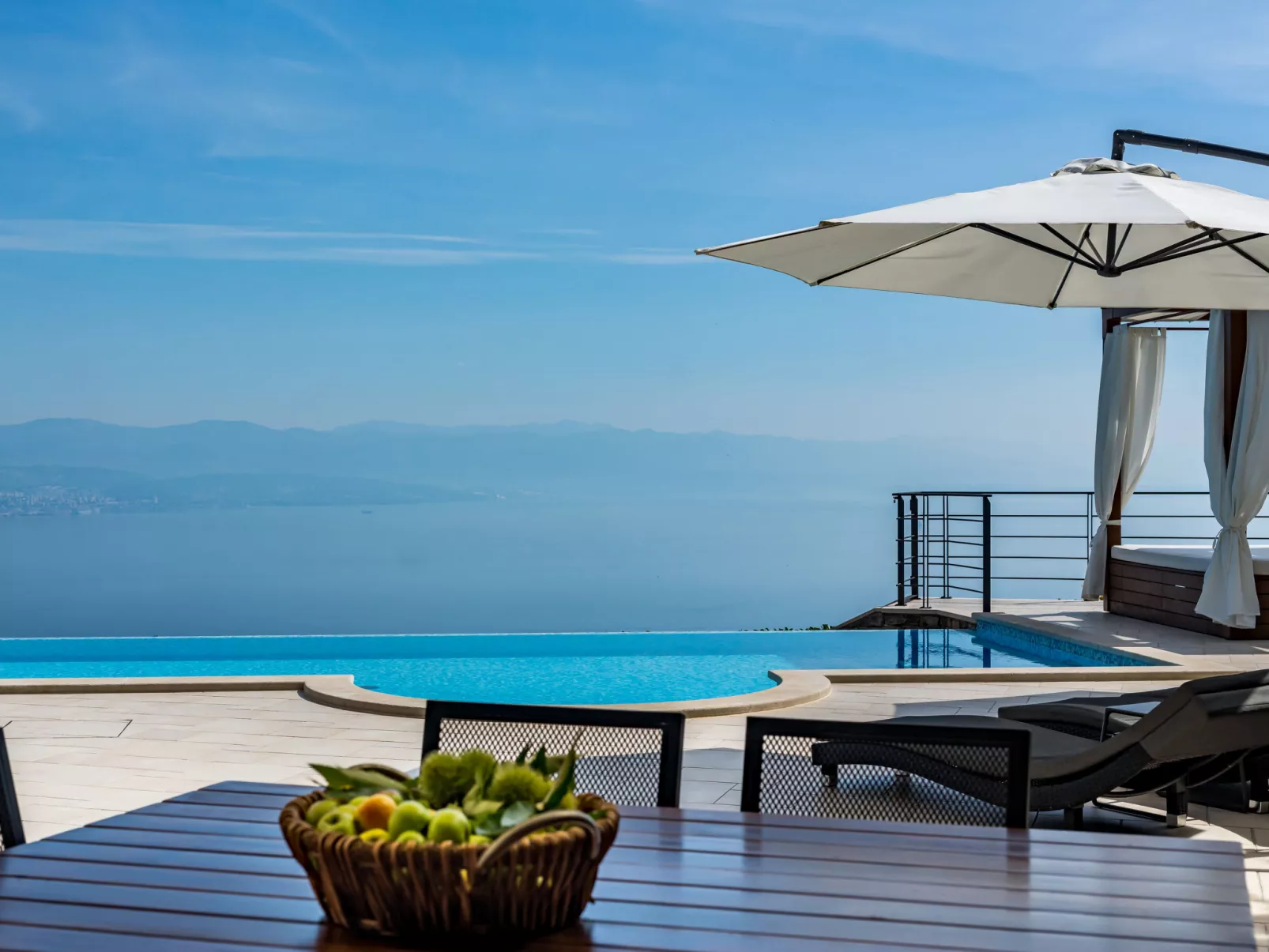 Mooi villa "Marone", van 3 verdiepingen. Boven Lovran, in het gehucht Dobreć, 5 km van het centrum van Lovran, rustige, zonnige, verhoogde ligging, 5 km van zee, aan een doodlopende weg, te midden van groen. Voor alleengebruik: terrein 900 m2 (omheind), openluchtzwembad hoekig, verwarmd (10 x 4 m, 135 cm diepte, seizoensgebonden beschikbaarheid: 15.Mei. - 30.Sep.) met trap. Buitendouche, poolhouse met douche, WC en fornuis, terras (150 m2), tuinmeubelen, barbecue, kinderspeelplaats (schommel). In het huis: internetaansluiting, air-conditioning, alarmsysteem, wasmachine, droger. Parkeerplaats (voor 3 auto's) bij het huis op het terrein. Oplaadstation. Winkel 1.3 km, restaurant 5 km, bushalte 3 km, kiezelstrand 5 km, strandbad 5 km, betonnen strand 5 km. Geschikt voor families. Groepen jongeren zijn niet toegestaan.