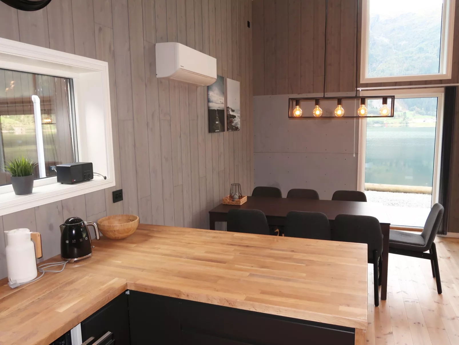 "Mathias", chalet 6-kamers 115 m2 op 2 verdiepingen. Licht, smaakvol ingericht: open woon-/eetkamer met TV en verwarming. 1 kamer met 1 2-pers bed (160 cm, lengte 200 cm). 1 kamer met 1 bed (90 cm, lengte 200 cm). Open keuken (oven, afwasmachine, 4 inductiekookplaten, broodrooster, waterkoker, magnetron, diepvriezer, elektrische koffiemachine) met eettafel. Douche/WC. Bovenverdieping: open woonkamer. 1 kamer met 1 2-pers bed (160 cm, lengte 200 cm). 1 kamer met 2 bedden (80 cm, lengte 200 cm). Mooi panoramazicht op zee, de bergen en fjord. Ter beschikking: wasmachine, sauna. Internet (WiFi, gratis). Niet rokers woning. 924531169