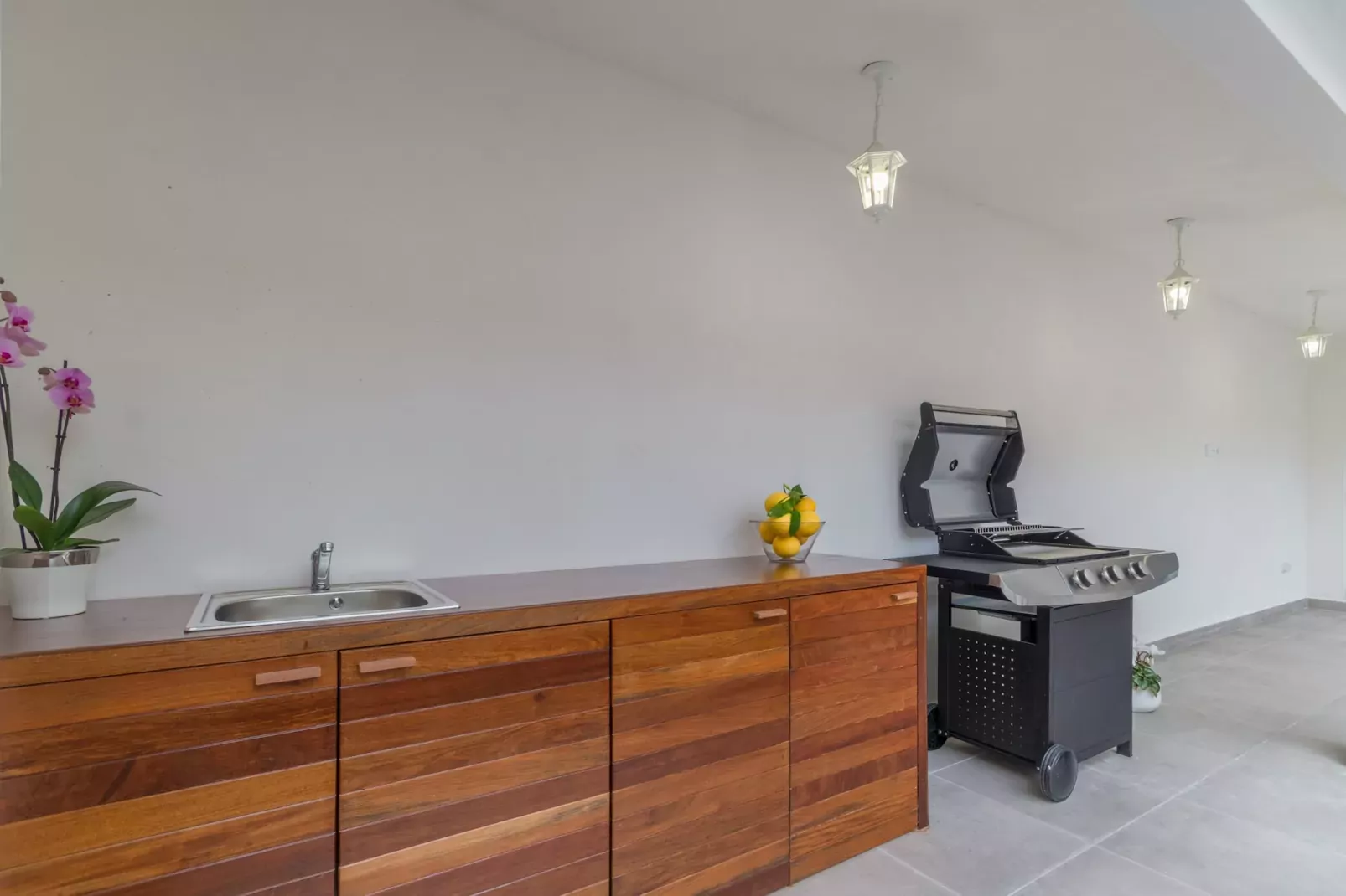 In de villa vindt u een volledig uitgeruste, aparte keuken met een mix van gas- en elektrische kookapparatuur, waaronder een koelkast, magnetron, oven en vaatwasser. Een ruim terras van 130 m² biedt voldoende ruimte om buiten te eten en te ontspannen, aangevuld met een barbecue voor maaltijden in de buitenlucht.