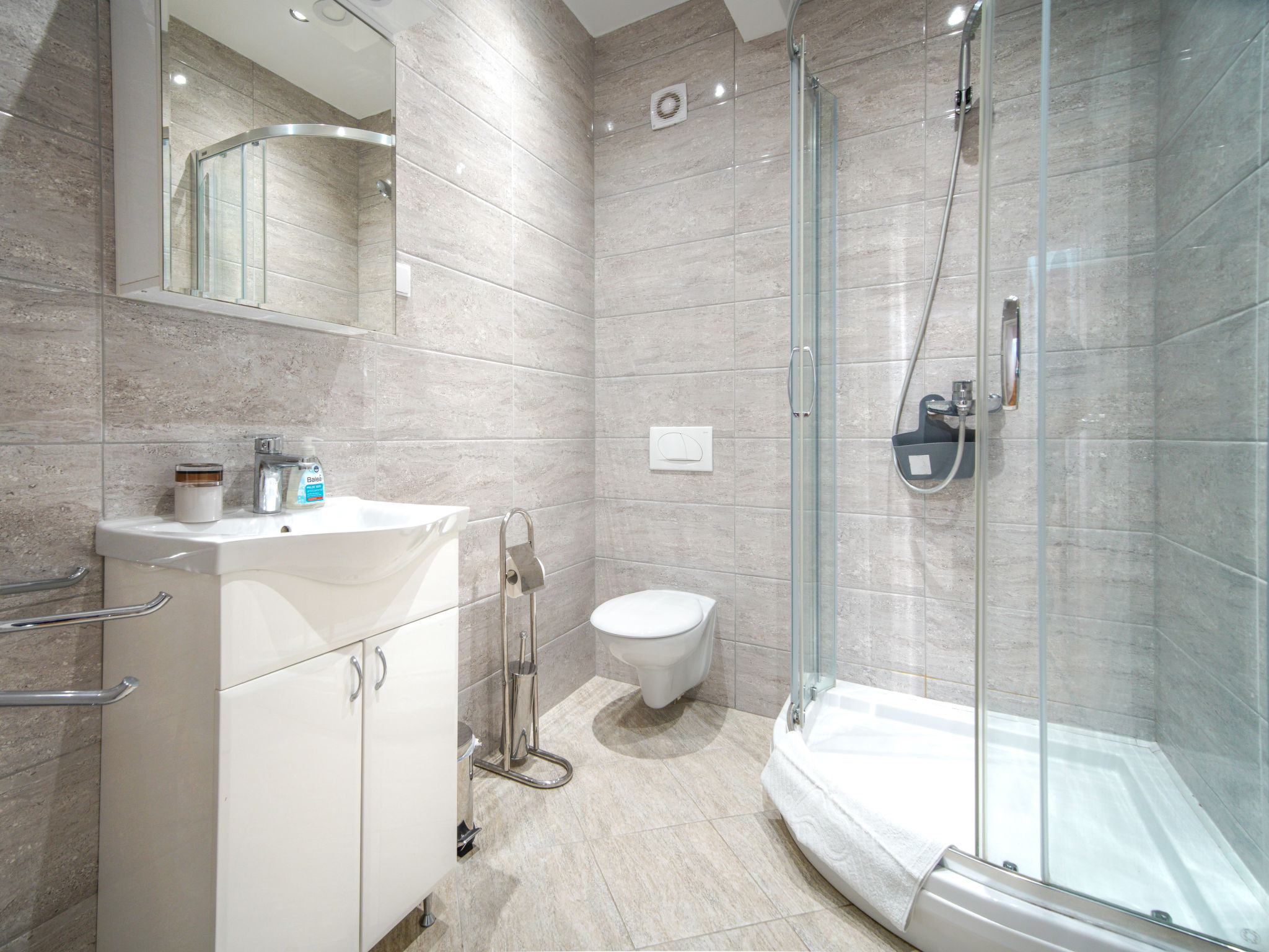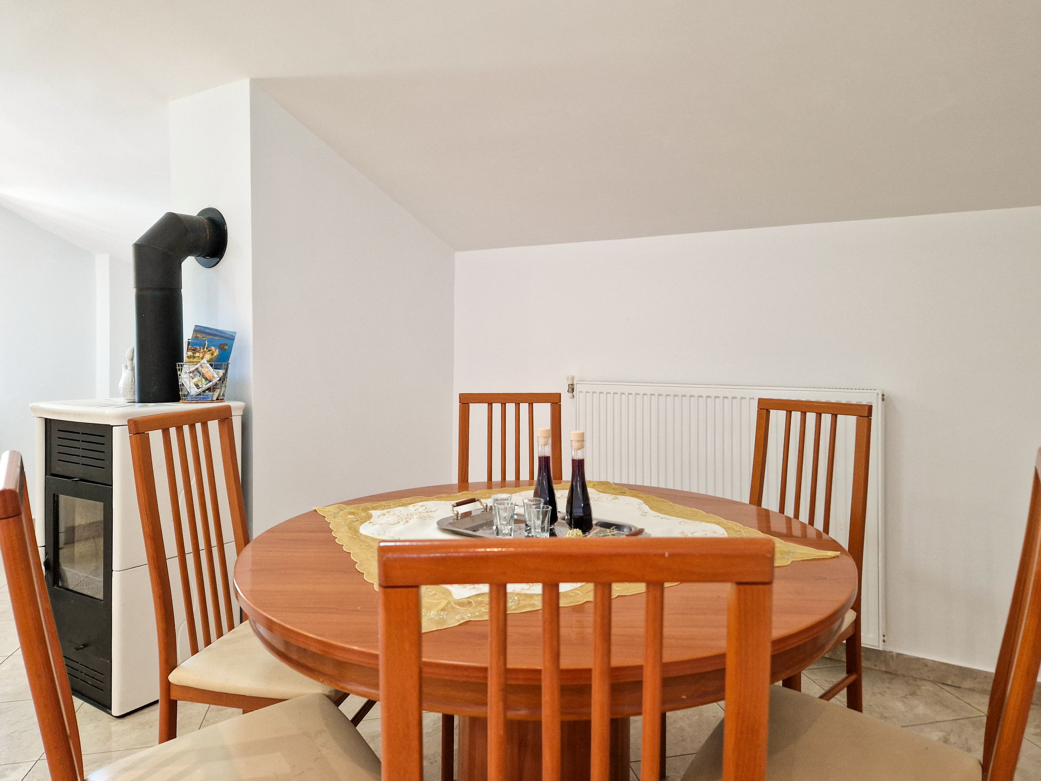 Appartement 3-kamers 110 m2, op de bovenste verdieping. Mooi en gezellig ingericht: woon-/eetkamer 46 m2, met afgeschuinde daken, hoogte van het plafond 165 - 280 cm met 1 divanbed (150 cm, lengte 190 cm), Sat-TV (Flatscreen TV), air-conditioning. Uitgang naar het terras. 1 kamer met afgeschuinde daken, hoogte van het plafond 165 - 280 cm met 1 2-pers bed (2 x 90 cm, lengte 200 cm). 1 kamer met afgeschuinde daken, hoogte van het plafond 165 - 280 cm met 2 bedden (90 cm, lengte 200 cm). Met afgeschuinde daken, open keuken (4-pits kookplaat, oven, afwasmachine, magnetron, elektrische koffiemachine), hoogte van het plafond 165 - 280 cm. Douche/WC, aparte WC, bad/douche/WC. Verwarming, air-conditioning. Verwarming alleen beschikbaar van 01.11. tot 01.05. Terras 22 m2, overdekt, terras 7 m2, overdekt. Terrasmeubelen. Ter beschikking: wasmachine, kinderbed. Internet (WiFi, gratis). Maximaal 1 huisdier/hond toegestaan. Privé ingang.