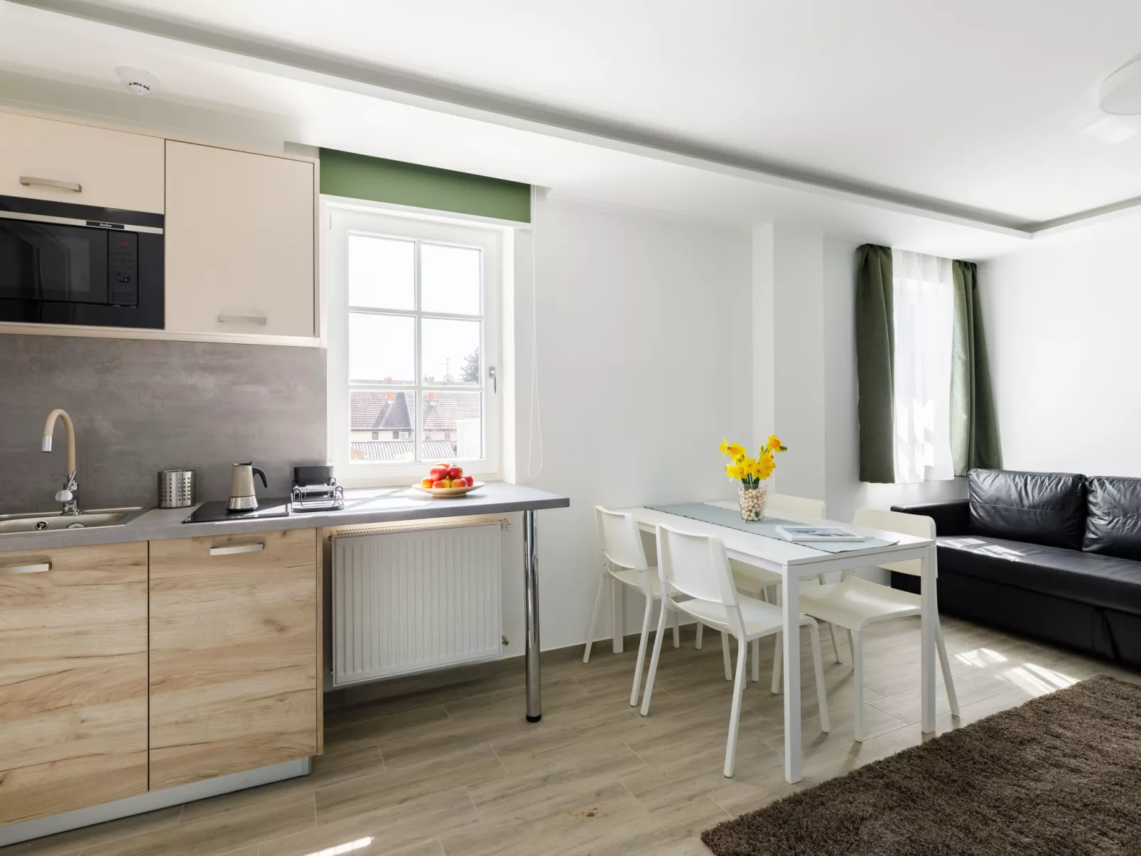 "Park 5", appartement op de bovenverdieping. Mooi en modern ingericht: open woon-/eetkamer met 2 divanbedden en Kabel-TV (Flatscreen TV). 1 2-pers. kamer met 1 2-pers bed (160 cm, lengte 200 cm). Kleine, open keuken (2 keramische glas kookplaten, magnetron, elektrische koffiemachine). Douche/WC. Vloerverwarming. Solarstroom. Op het noordwesten gelegen. Ter beschikking: kinderstoel, kinderbed (extra), haardroger. Internet (Internet (WiFi)). Appartement aan de binnenplaats.