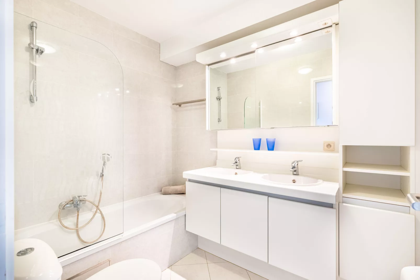 Het appartement omvat een inkomhal met apart toilet, vestiaire, woonkamer met balkon/terras rondom, open en uitgeruste keuken met keramische kookplaat, vaatwasser, gecombineerde magnetron-oven, koelkast met vriezer. Een berging met wasmachine, droger, strijkijzer, strijkplank, droogrek. Eethoek met tafel en 8 stoelen, 2 stoelen + poef (Ikea Pello-model), slaapbank voor 2 personen in de woonkamer, 1 slaapkamer met 1 tweepersoonsbed en eigen aangrenzende badkamer met douche, 2e slaapkamer met stapelbed en uitschuifbare lattenbodem + matras voor één persoon, 3e slaapkamer met 2 eenpersoonsbedden naast elkaar, 2e badkamer met bad, toilet en wastafel.