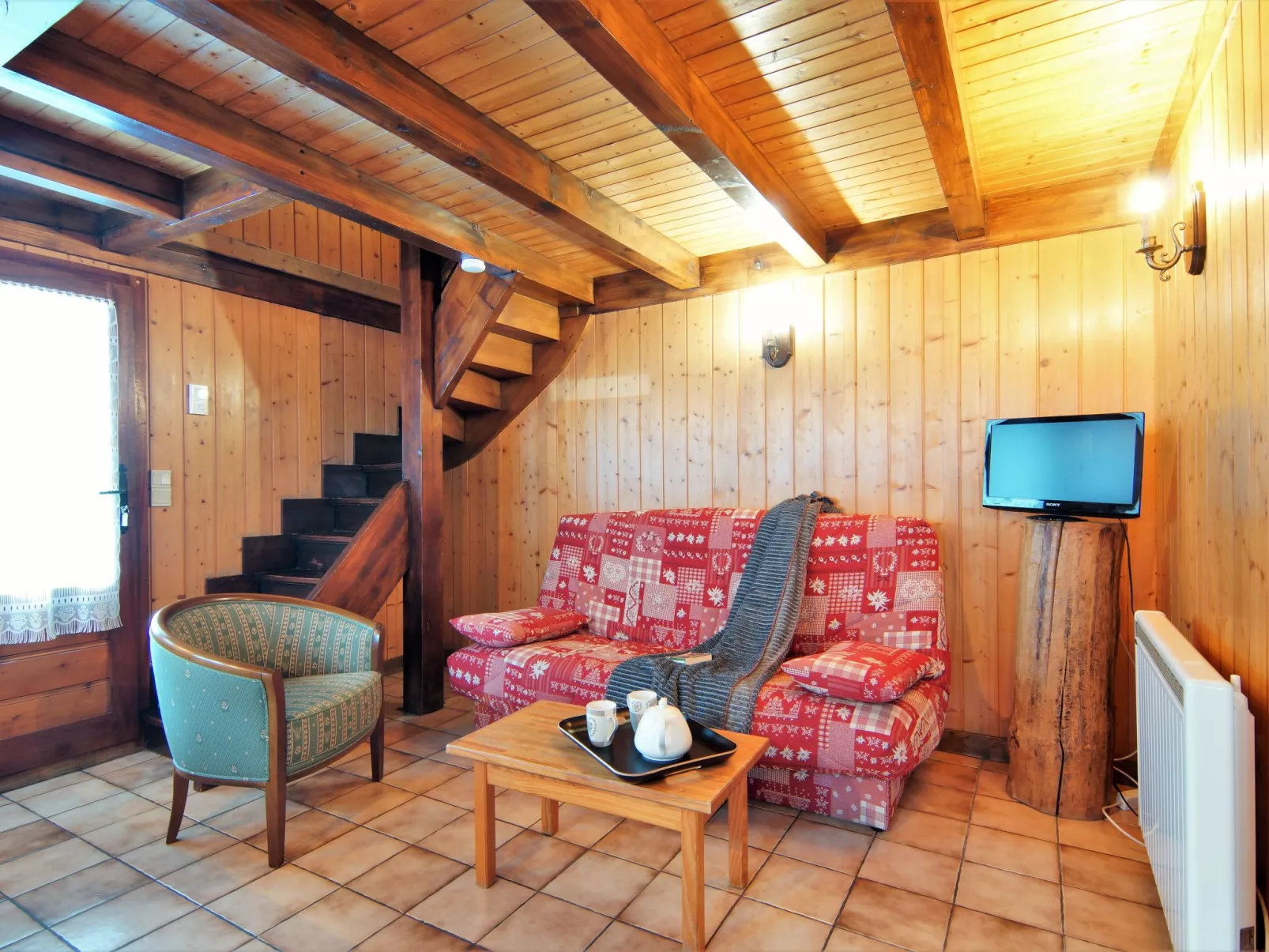 Chalet 3-kamers 60 m2 op 2 verdiepingen. Zeer eenvoudig en met veel hout ingericht: woon-/eetkamer met 1 2-pers divanbed (130 cm, lengte 190 cm), TV. Kookhoek (oven, afwasmachine, 4 keramische glas kookplaten, waterkoker, elektrische koffiemachine, raclette oven). Douche/WC. Bovenverdieping: 1 kamer met afgeschuinde daken, hoogte van het plafond 110 - 230 cm met 1 2-pers bed (130 cm, lengte 190 cm). 1 kamer met afgeschuinde daken, hoogte van het plafond 110 - 230 cm met 2 bedden en elektrische verwarming. Balkon, terras, op het zuidwesten gelegen, tuin. Uitzicht op de bergen. Ter beschikking: wasmachine. Internet (WiFi, extra). TV alleen FR. Rookmelders. 741430001464B