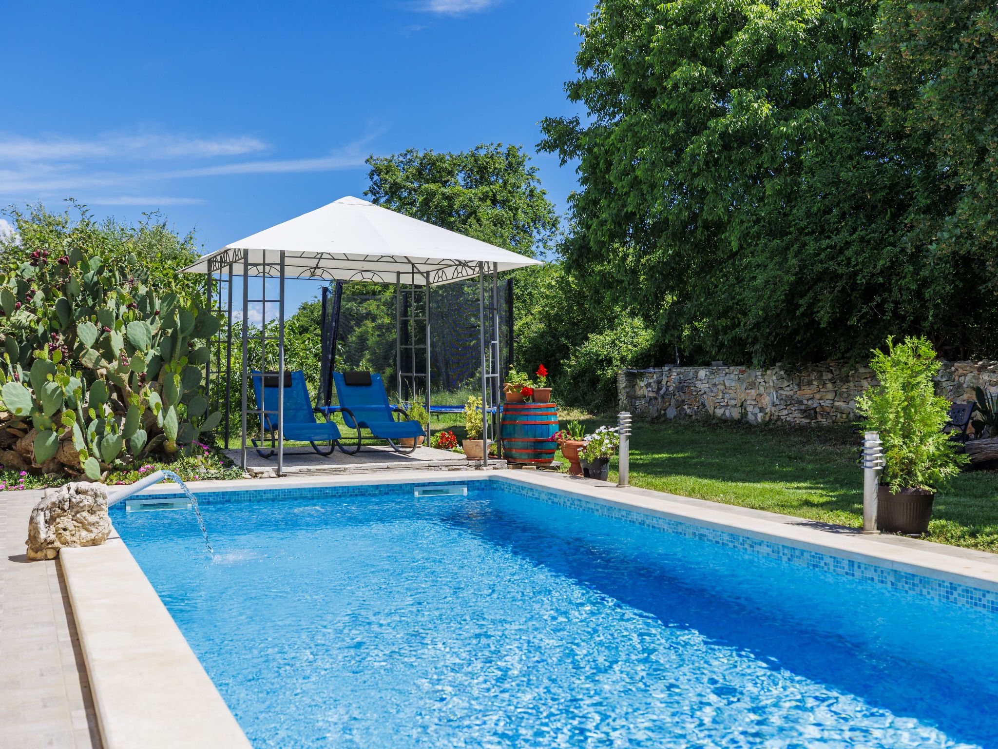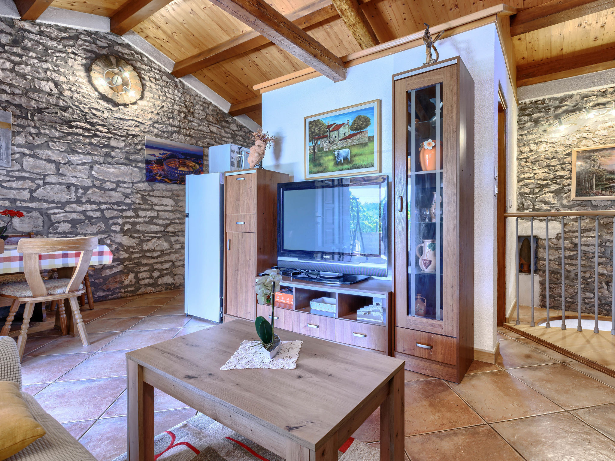 Rijtjeshuis "Pinezici", van 2 verdiepingen. In het gehucht Pinezići, 2 km van het centrum van Marčana, 12 km van het centrum van Pula, 11 km van het centrum van Duga Uvala, 11 km van zee. Voor medegebruik: terrein 2.000 m2 met gazon en bomen, openluchtzwembad (6 x 4 m, 120 cm diepte, seizoensgebonden beschikbaarheid: 20.Mei. - 30.Sep.) met trap. Terras, tuinmeubelen. In het huis: internetaansluiting, trampoline, wasmachine. Parkeerplaats (voor 2 auto's) op het terrein. Winkel 2 km, restaurant 2 km, bushalte 2 km, kiezelstrand 13 km, rotsstrand 11 km. Jachthaven 16 km.
