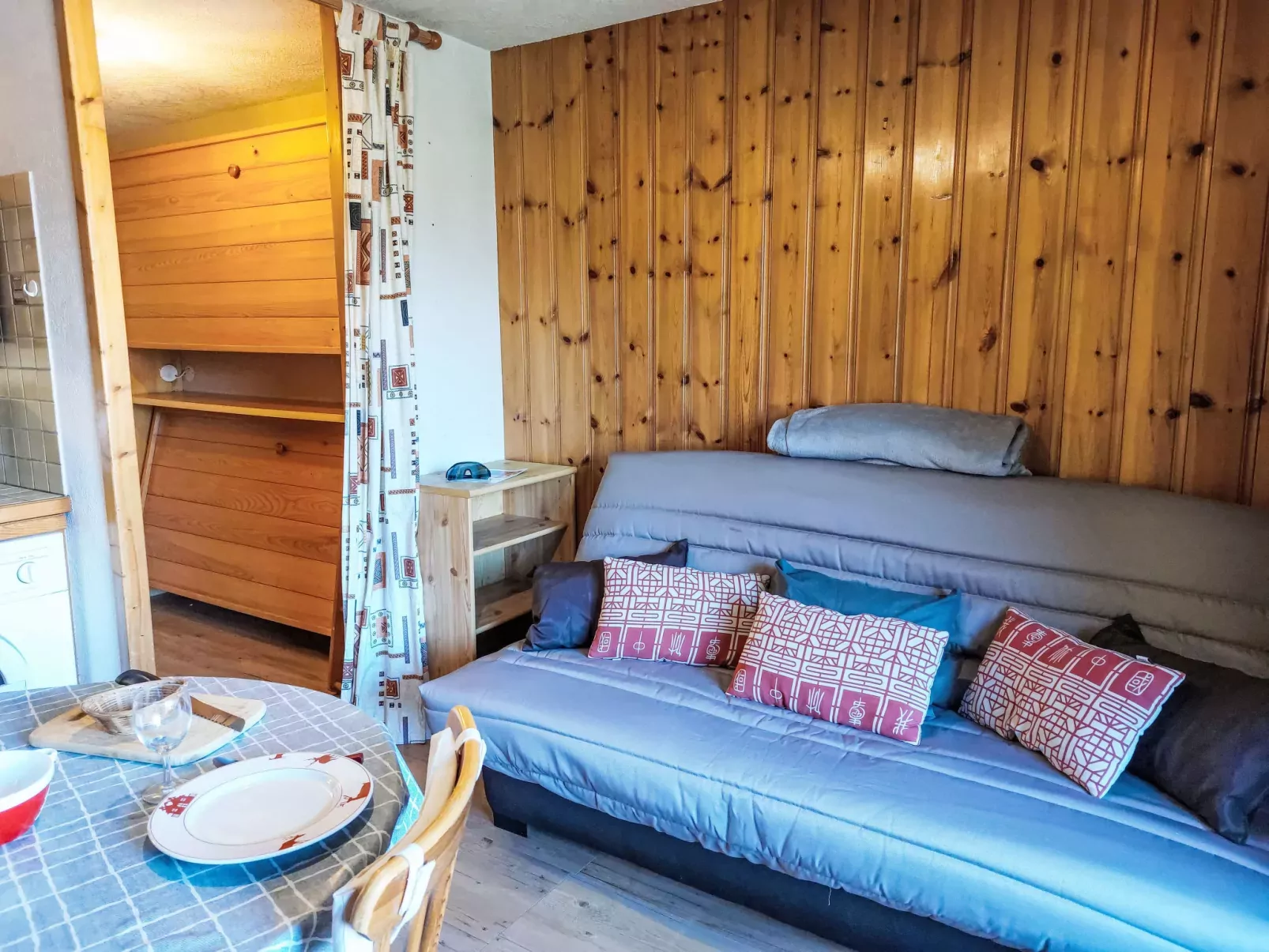 "La pointe des Aravis 3", studio 1-kamer 20 m2 op de 1e verdieping. Hal met 1 opklapbed (90 cm, lengte 190 cm). Woon-/eetkamer met 1 2-pers divanbed (140 cm), TV en Flatscreen TV. Uitgang naar het balkon. Kookhoek (mini-oven, broodrooster, waterkoker, elektrische koffiemachine). Badkamer, aparte WC. Elektrische verwarming. Balkon, op het noorden gelegen en op het oosten gelegen. Mooi uitzicht op de bergen. Ter beschikking: wasmachine. Internet (WiFi, extra). Niet rokers woning. 1 klein huisdier/hond toegestaan. TV alleen FR. Rookmelders, geen lift.