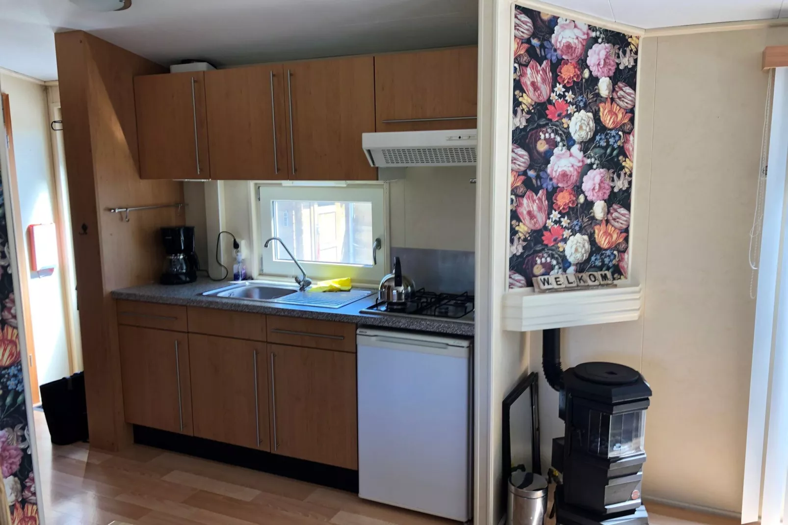 Verscholen in het rustige vakantiepark Wiringherlant biedt dit keurig ingerichte, vrijstaande chalet een ontspannende vakantie met alle comfort van thuis. Stap binnen in de warme en uitnodigende woonkamer, waar een gaskachel de sfeer bepaalt voor gezellige avonden. De open keuken is voorzien van alle benodigdheden om uw favoriete maaltijden te bereiden en de indeling omvat twee slaapkamers: één met een comfortabel tweepersoonsbed en één met een stapelbed, perfect voor kinderen. Een schone, moderne badkamer met douche en toilet maakt de binnenruimte compleet.