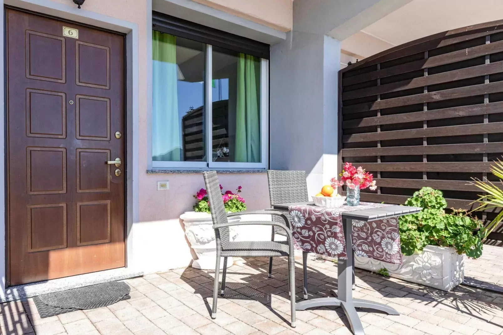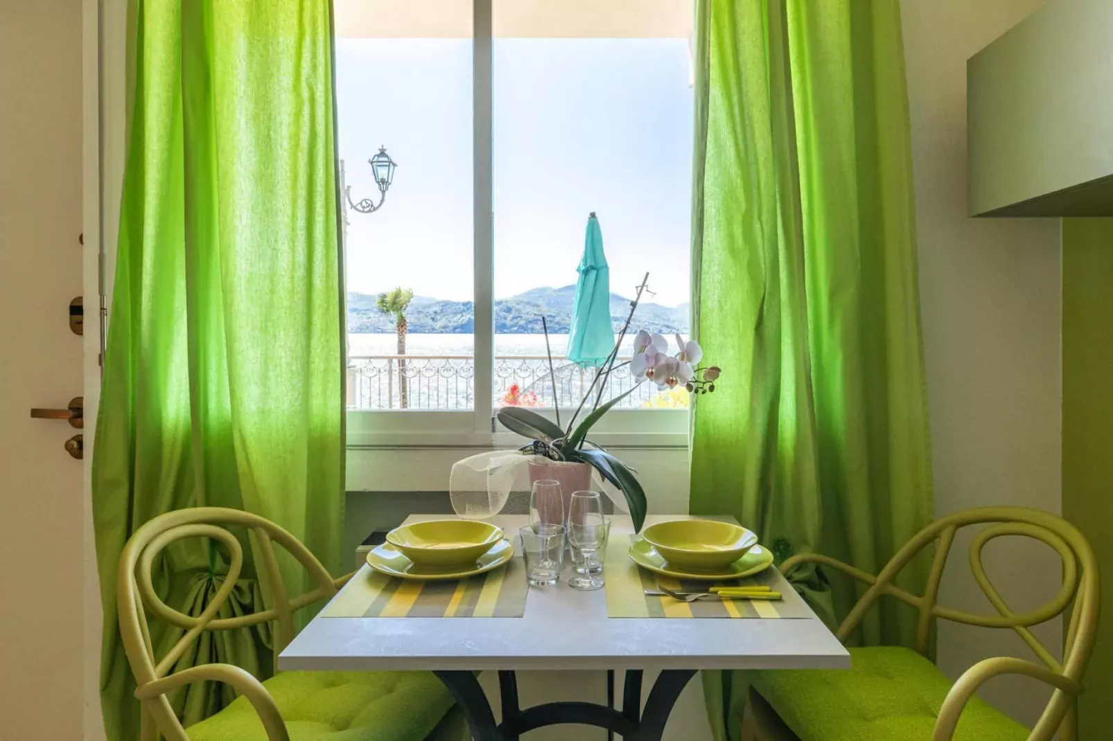 Sommige studio's met uitzicht op het meer hebben een balkon met tuinmeubilair.