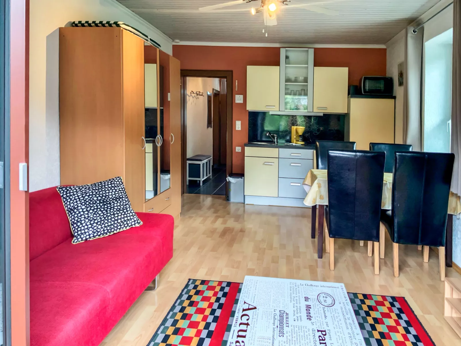 Studio 2-kamers 42 m2 op de 1e verdieping. Volledig gerenoveerd in 2013, modern en gezellig ingericht: hal. Woon-/slaapkamer met 1 divanbed, eettafel, Sat-TV en radio. Uitgang naar het balkon. 1 kamer met 1 2-pers bed (140 cm, lengte 200 cm). Open keuken (oven, afwasmachine, 2 keramische glas kookplaten, broodrooster, waterkoker, elektrische koffiemachine). Uitgang naar het balkon. Douche/WC. Elektrische verwarming. Parketvloeren. Balkon 4 m2. Terrasmeubelen. Mooi uitzicht op de bergen en het dal. Ter beschikking: wasmachine, kinderstoel, kinderbed tot 2 jaar. Internet (Internet (WiFi), gratis). Woning aan de straatzijde. Niet rokers woning. Let op: baby's en peuters tellen als een vol persoon en kunnen niet gratis worden meegenomen. 50403-000215-2020