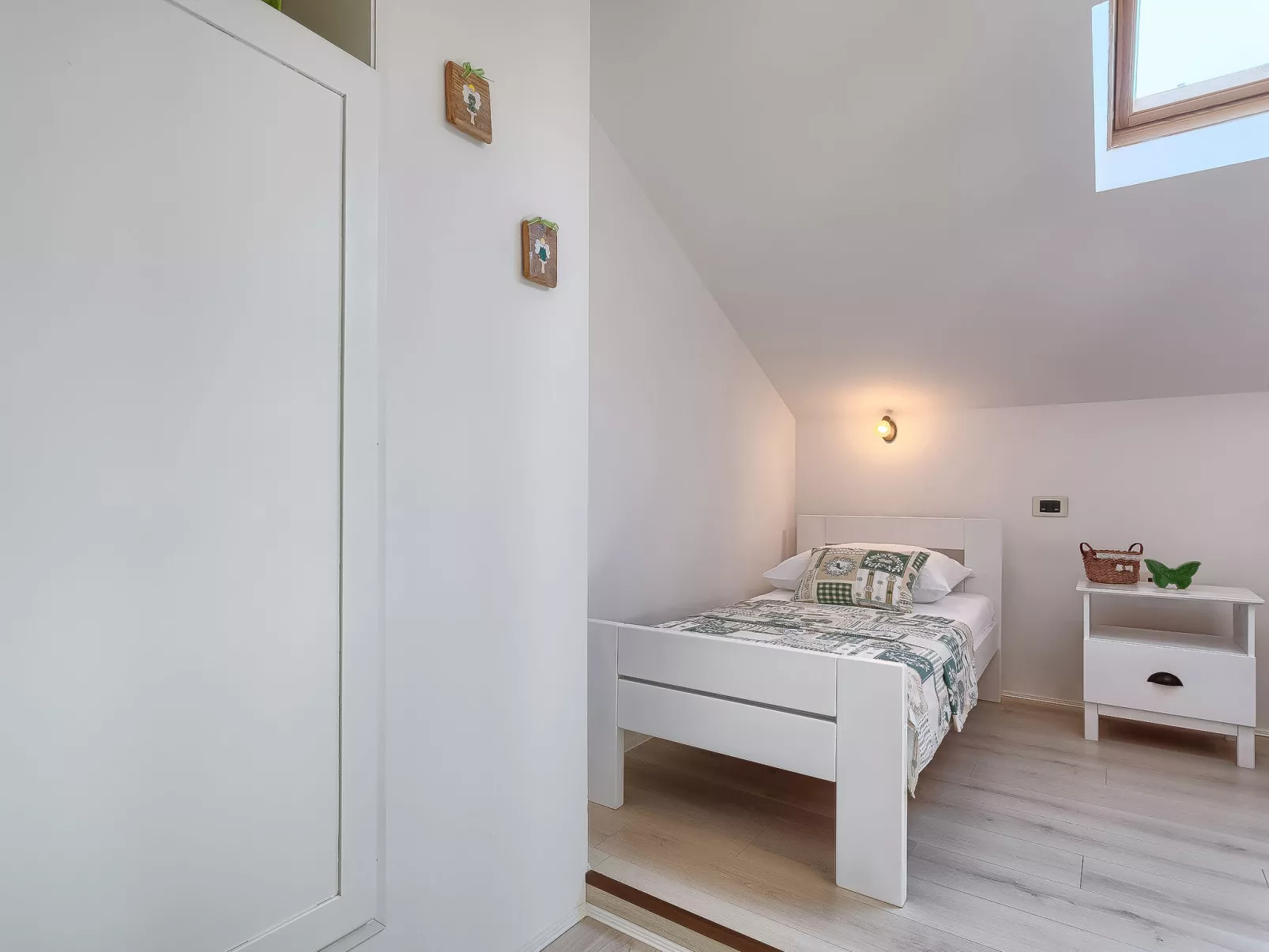 Appartement 2-kamers 72 m2 op de 1e verdieping. Woon-/eetkamer met 1 divanbed (140 cm, lengte 200 cm), Sat-TV (Flatscreen TV), air-conditioning. Open galerij, met afgeschuinde daken, hoogte van het plafond 120 - 240 cm met dakraam met 2 bedden (90 cm, lengte 200 cm). 1 kamer met 1 2-pers bed (2 x 90 cm, lengte 190 cm). Open keuken (4-pits kookplaat, oven, afwasmachine, magnetron, elektrische koffiemachine, pads voor de koffiemachine (dolce gusto)). Douche/WC. Vloerverwarming, heteluchtverwarming. Terras 12 m2, overdekt. Terrasmeubelen. Uitzicht op zee en de tuin. Ter beschikking: wasmachine, strijkijzer. Internet (WiFi, gratis).