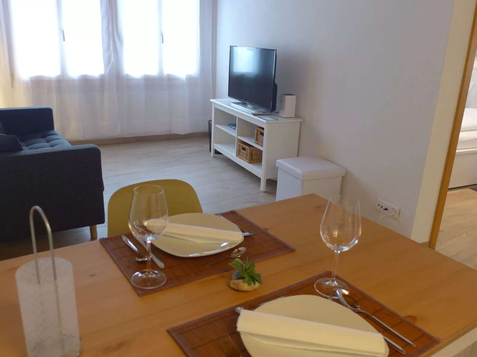 Appartement 2-kamers 50 m2 op de 1e verdieping, op het zuiden gelegen. Volledig gerenoveerd in 2021, modern en gezellig ingericht: woon-/eetkamer met Kabel-TV (Flatscreen TV). 1 2-pers. kamer (2 x 90 cm, lengte 200 cm). Open keuken (oven, afwasmachine, 4 keramische glas kookplaten, broodrooster, waterkoker, elektrische koffiemachine, pads voor de koffiemachine (Nespresso) extra, raclette oven, fondue Set (kaas)). Douche/WC. Natuurstenen vloeren. Beperkt uitzicht op de bergen. Ter beschikking: Internet (Internet (WiFi), gratis). Parkeerplaats bij het huis. Privé ingang.