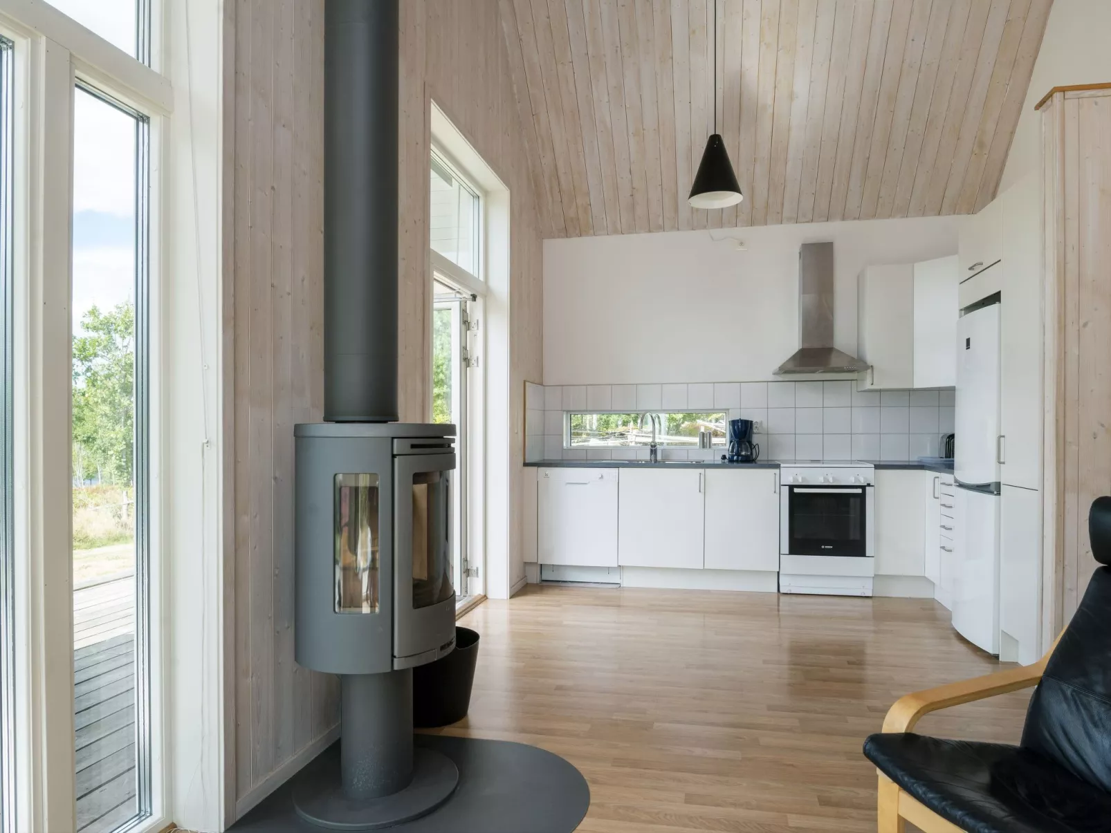 "Skogstorp", huis 4-kamers 75 m2 op 2 verdiepingen. Modern en gezellig ingericht: open woon-/eetkamer met schuifdeur, panoramavenster met zwedenkachel, eettafel en DVD. Uitgang naar de veranda. 1 kamer met 1 2-pers bed. 1 kamer met 1 x 2 stapelbedden. Open keuken (oven, 4 keramische glas kookplaten, broodrooster, waterkoker, magnetron, diepvriezer, elektrische koffiemachine). Uitgang naar de veranda. Douche/WC. Vloerverwarming. Bovenverdieping: (steile trap) met afgeschuinde daken, 1 kamer met 1 2-pers bed. Kleine woonkamer met afgeschuinde daken met Sat-TV. Parketvloeren. Terras gedeeltelijk overdekt. Terrasmeubelen, barbecue. Uitzicht op het meer. Ter beschikking: wasmachine, kinderstoel, kinderbed tot 2 jaar. Internet (Internet (WiFi), gratis). Niet rokers woning. Rookmelders, brandblusser.