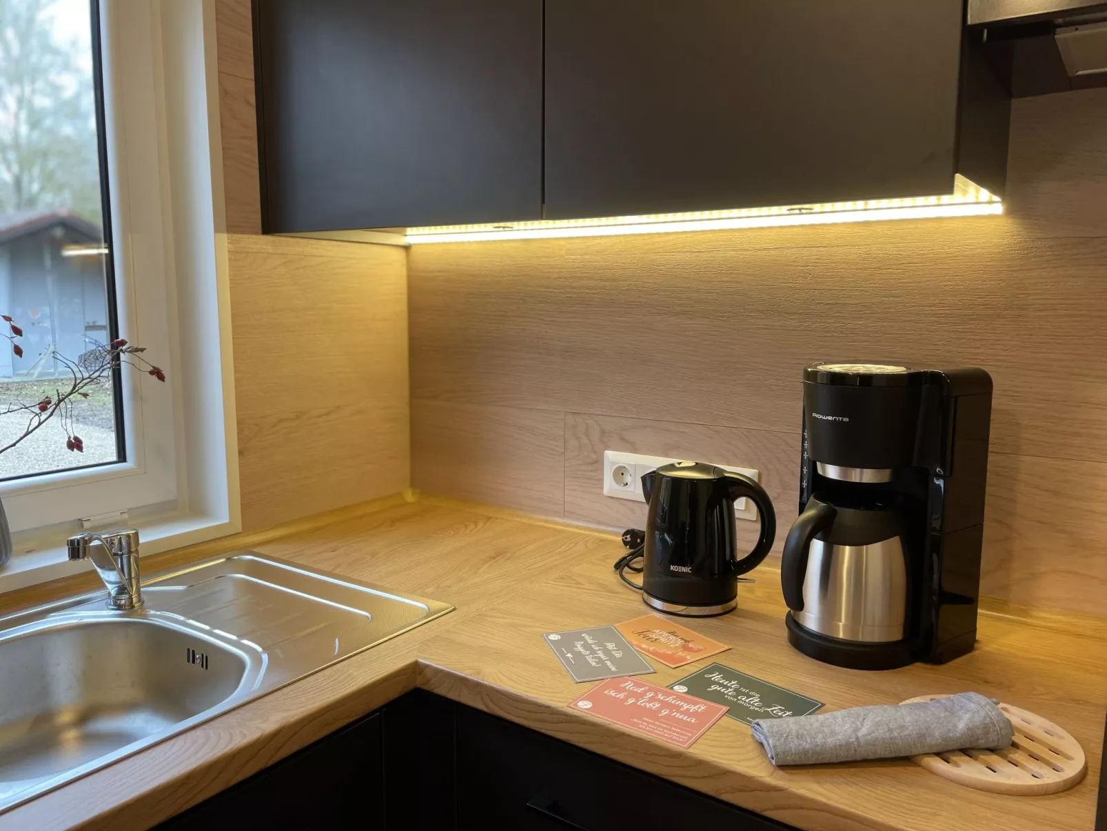 "Tiny Haus Soul & Lake", 3-kamers mobilhome 29 m2. Gezellig ingericht: woon-/eetkamer met eettafel en Sat-TV (Flatscreen TV). Uitgang naar het terras. 1 kamer met 1 2-pers bed (140 cm, lengte 200 cm). 1 kamer met 2 bedden (80 cm, lengte 200 cm). Kookhoek (oven, afwasmachine, 2 inductiekookplaten, waterkoker, elektrische koffiemachine). Douche/WC. Terras. Terrasmeubelen, elektrische barbecue (verrijdbaar). Ter beschikking: Internet (WiFi, gratis). Niet rokers woning. Rookmelders, brandblusser.