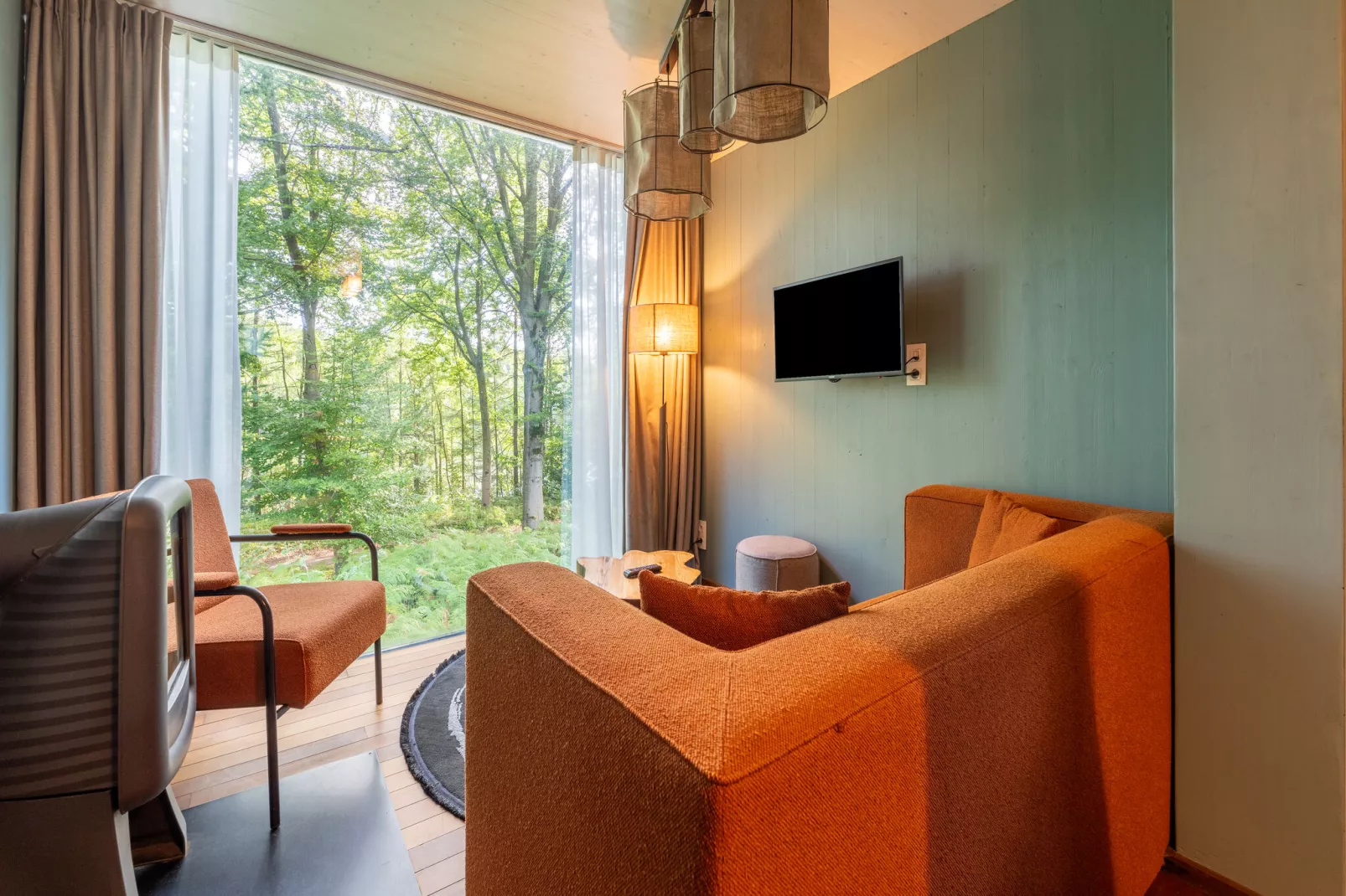 Ervaar Lushwood, een 85 m² groot toevluchtsoord midden in het bos Domaine du Bois de Fouage. Ontworpen voor twee volwassenen en twee gasten, biedt het een warm, door de natuur geïnspireerd interieur met een koelkast, vaatwasser en koffiezetapparaat in de open keuken en eetkamer.