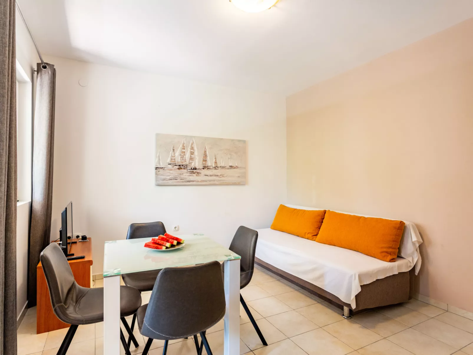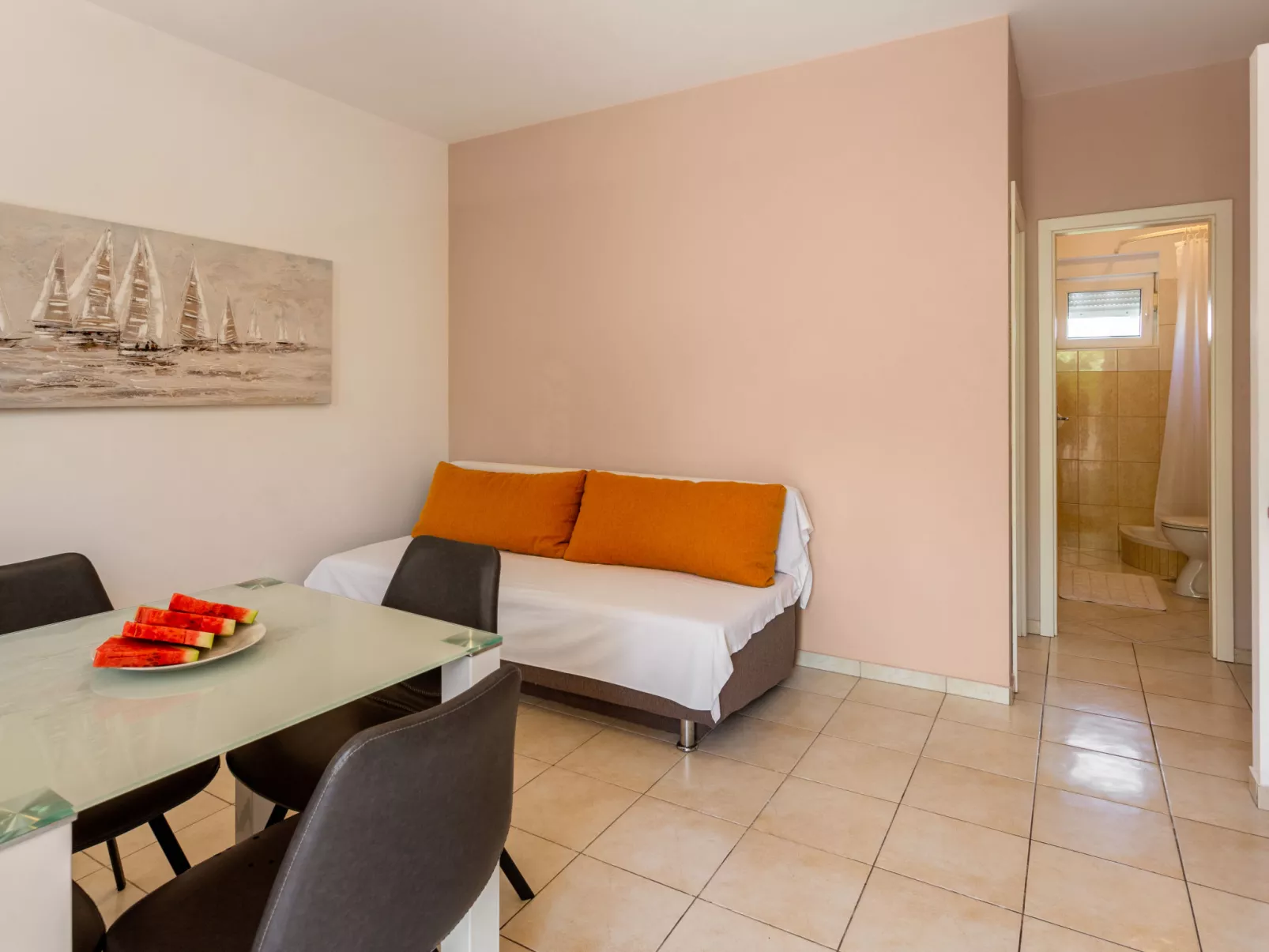 Appartementencomplex "Tino". In het centrum van Sukošan, 10 km van het centrum van Zadar, 200 m van zee, 200 m van het strand. Voor medegebruik: terrein 200 m2. Buitendouche, terras, tuinmeubelen, barbecue. In het huis: internetaansluiting. Parkeerplaats op het terrein. Supermarkt 650 m, bushalte 350 m, kiezelstrand, betonnen strand 200 m.