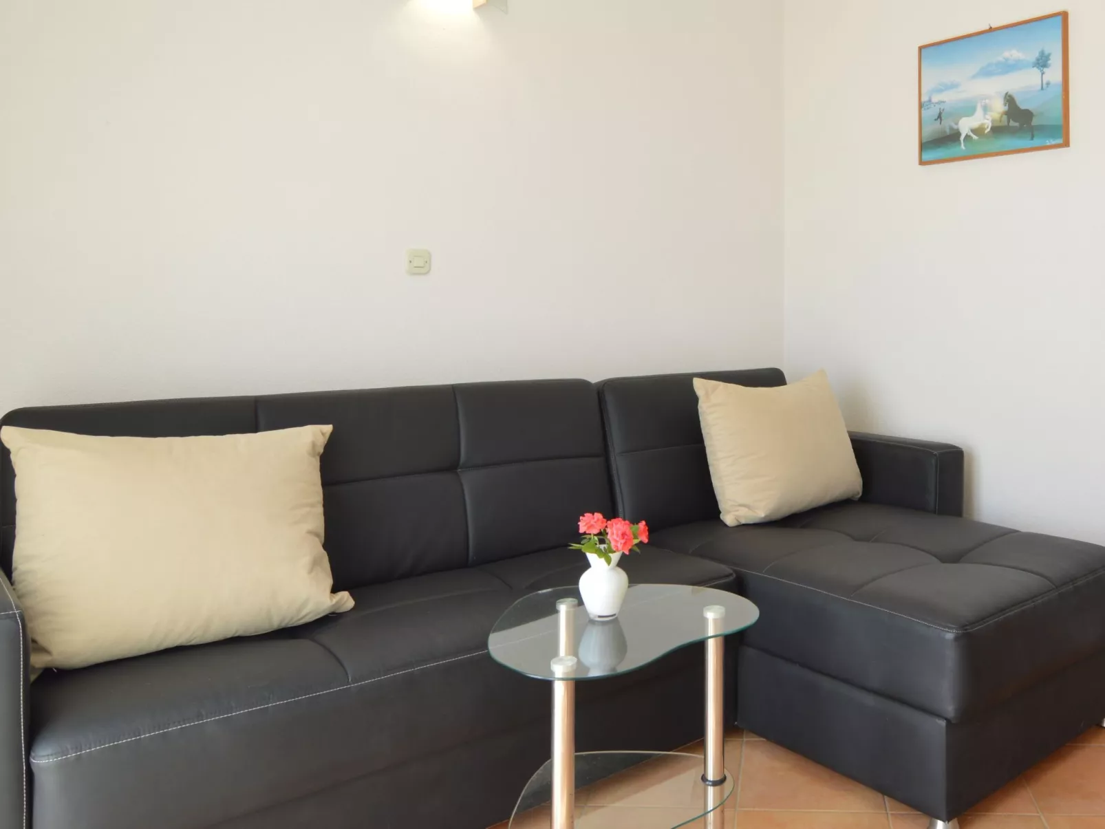 Appartement 3-kamers 54 m2 op de 1e verdieping. Woonkamer met Sat-TV (Flatscreen TV). Uitgang naar het terras. 1 kamer met 2 bedden (80 cm, lengte 190 cm). Uitgang naar het terras. 1 kamer met 1 2-pers bed (160 cm, lengte 200 cm). Uitgang naar het balkon. Open keuken (4-pits kookplaat, oven, afwasmachine, broodrooster, waterkoker, diepvriezer, elektrische koffiemachine) met eettafel, air-conditioning. Douche/WC. Geen verwarmingsmogelijkheid. Balkon 3 m2, terras 12 m2. Balkonmeubilair, ligstoelen (1). Beperkt uitzicht op zee. Ter beschikking: Internet (WiFi, gratis). Niet rokers woning.