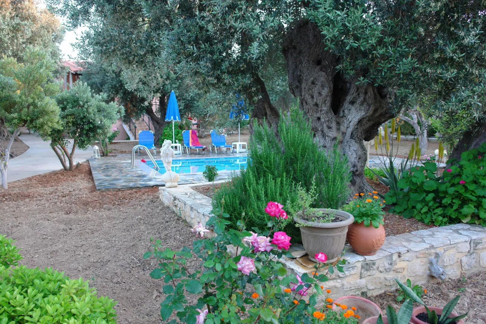 De tuin is werkelijk prachtig, vele fruitbomen en prachtige bloemen en struiken.