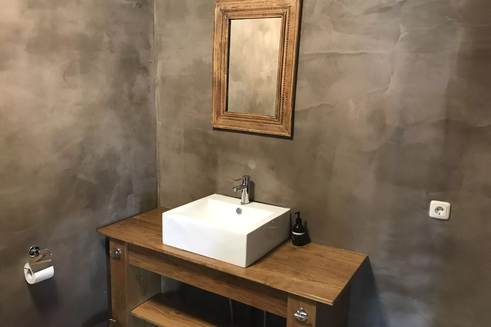 De badkamer met douche, wasbak, spiegel en toilet bevindt zich ook op de begane grond.